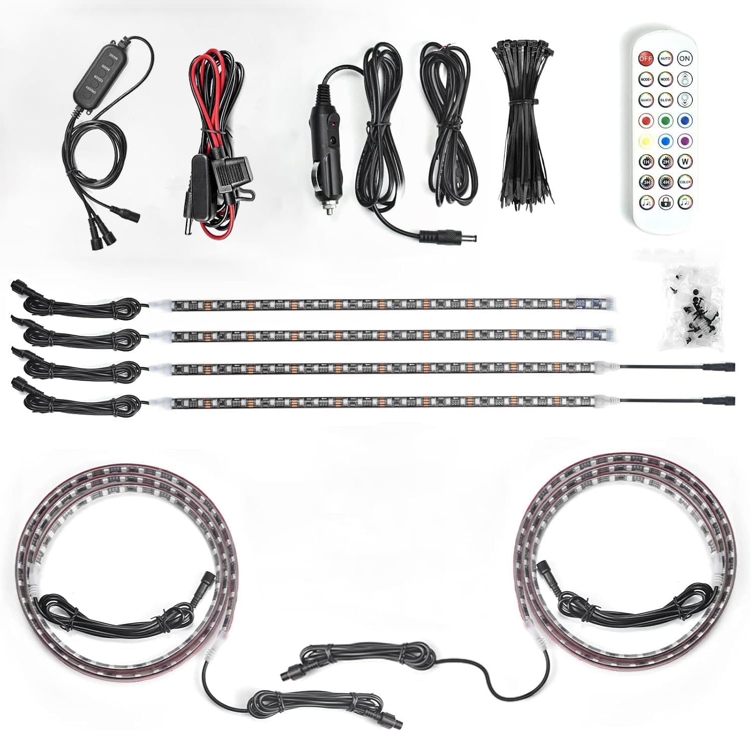 - 【Easy to Install】-The car underglow LED lights are equipped with 2 lines connecting 6 strip lights. 4 x 20.3 inch + 2 x 60.3 inch light strips design . Flexible tubing can be bended around corners easily. Strong 3M adhesive, zip ties even fixing clips and screws equipped it hold it on place firmly definitely. You can install them in various cars, like SUVs, trucks, Jeeps, JK, Vans, Boats, JL, pickup off road, UTV, motorcycle Decorations