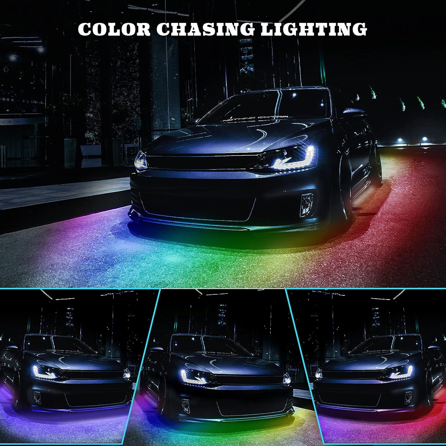 - 【Multiple Modes & DIY】-This Undercar Strips Lighting Kits have 10 Static modes, over 200 dynamic modes. with a built-in mic, your underglow car lights dance to the rhythm of your music, enjoy every beat of your favourite music when you are driving. The lights also with Breakpoint transfer function.