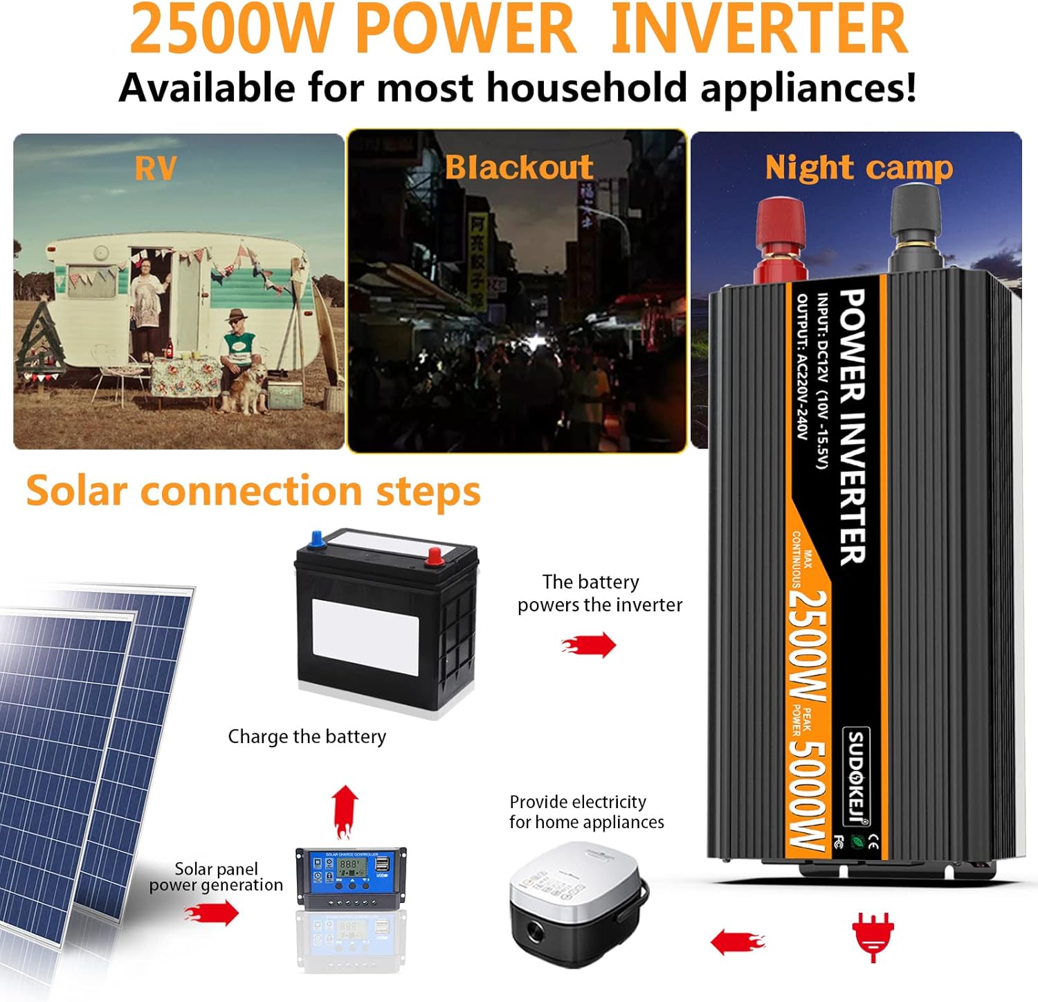 - [Package content]-1x DC 12V to AC110V/120V 2500W power inverter, 1x user manual, 1 set of 10² battery cables (1xRed, 1xBlack), 1x remote control, SUDOKEJI INVERTER, you deserve it