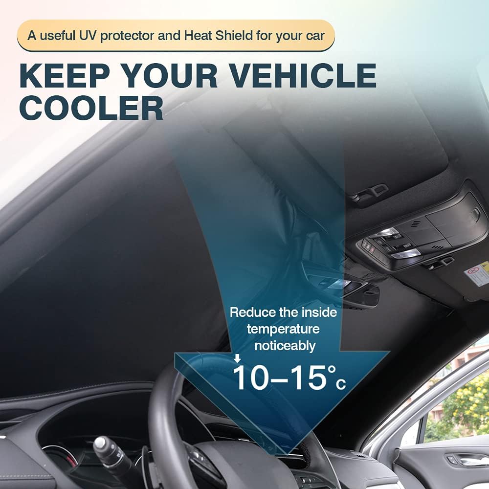 - Highly Reflective Protection -- The foldable sun shield will provide maximum protection for your car interior by blocking 99% of UV rays and sunlight. Not only protect the dashboard from fading and cracking, but also protect people skin by blocking the harmful UVA. Offering you a cool environment by lower the temperature by 50-59°F.