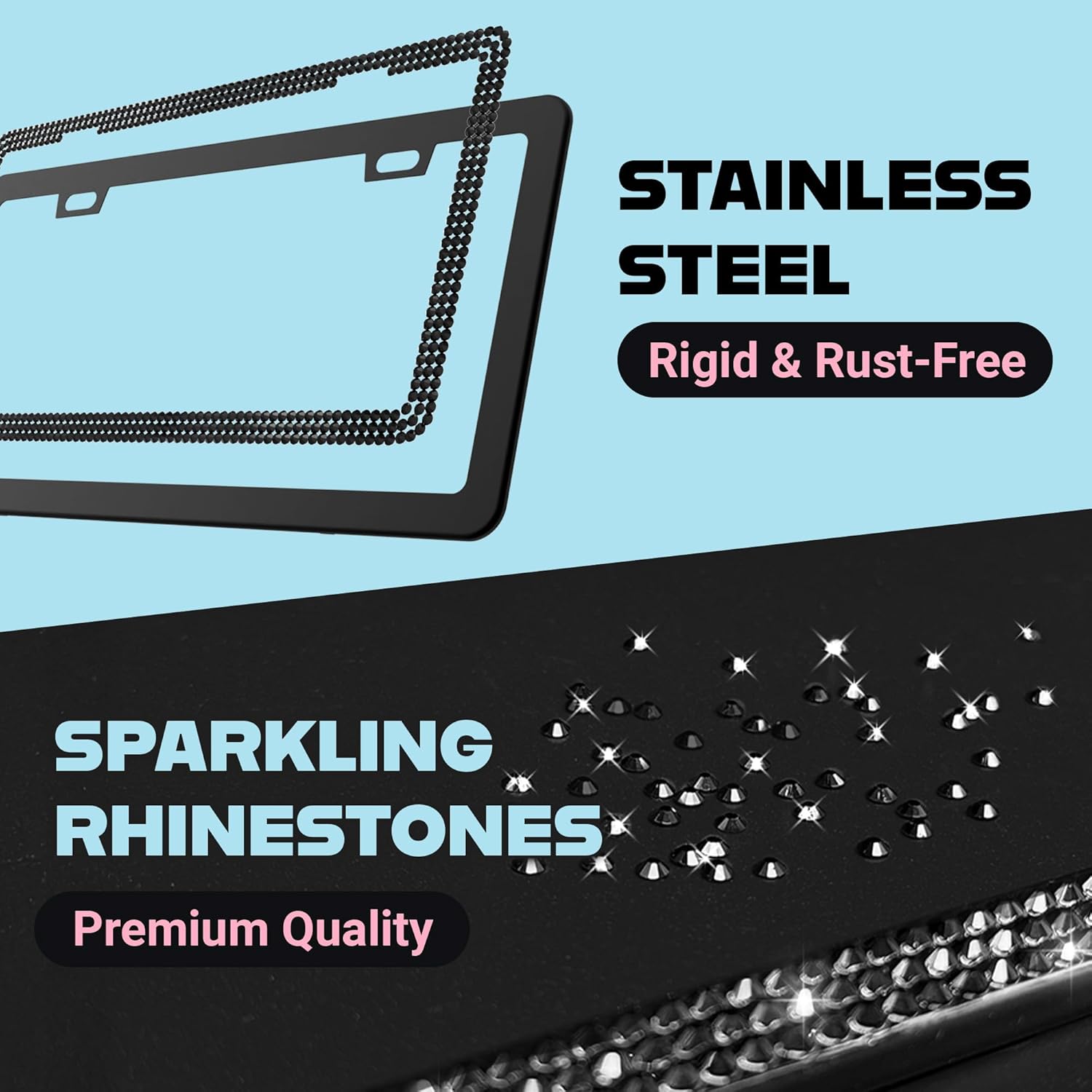 Elegant Bling License Plate Frames for Women - 2 Pack, 1600 Premium Black Rhinestones, Rust-Free Stainless Steel, Street Legal Slim Design, Sparkly Diamond Car Tag Holders with Glitter Crystal Covers