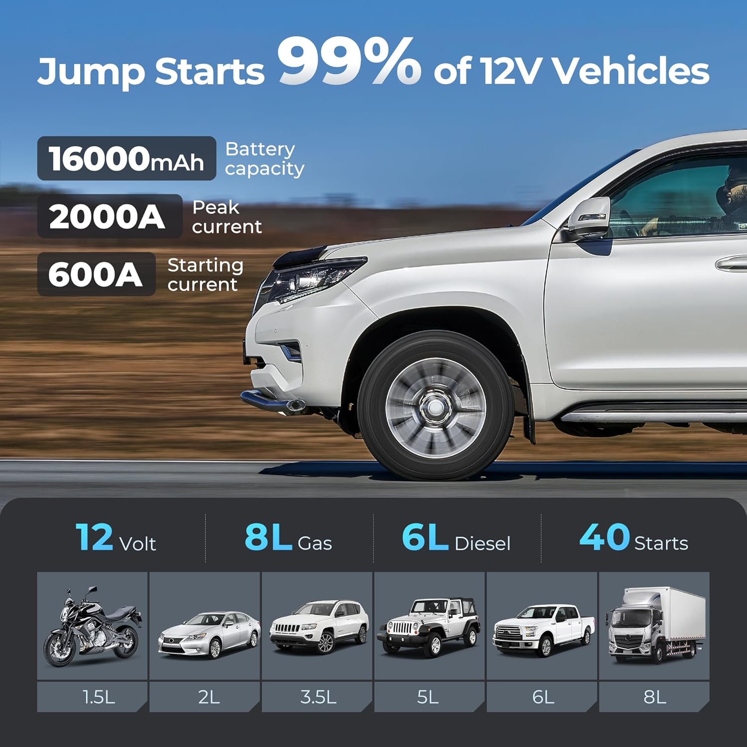 - Massive 2000 Peak Amps ➤ The JumpSurge 2000 car jump starter can deliver 2000 peak amps to restart 12V batteries (8.0L gasoline and 6.0L diesel engines) in 3 seconds. It supports quick and safe jumpstarts for cars, trucks, motorcycles, yachts, lawnmowers, ATVs, SUVs, snowmobiles, and even boats - up to 40 times on a single charge. Whether in extremely cold or extremely hot desert climates, all 12V vehicles can start safely. Never be without power on the road!