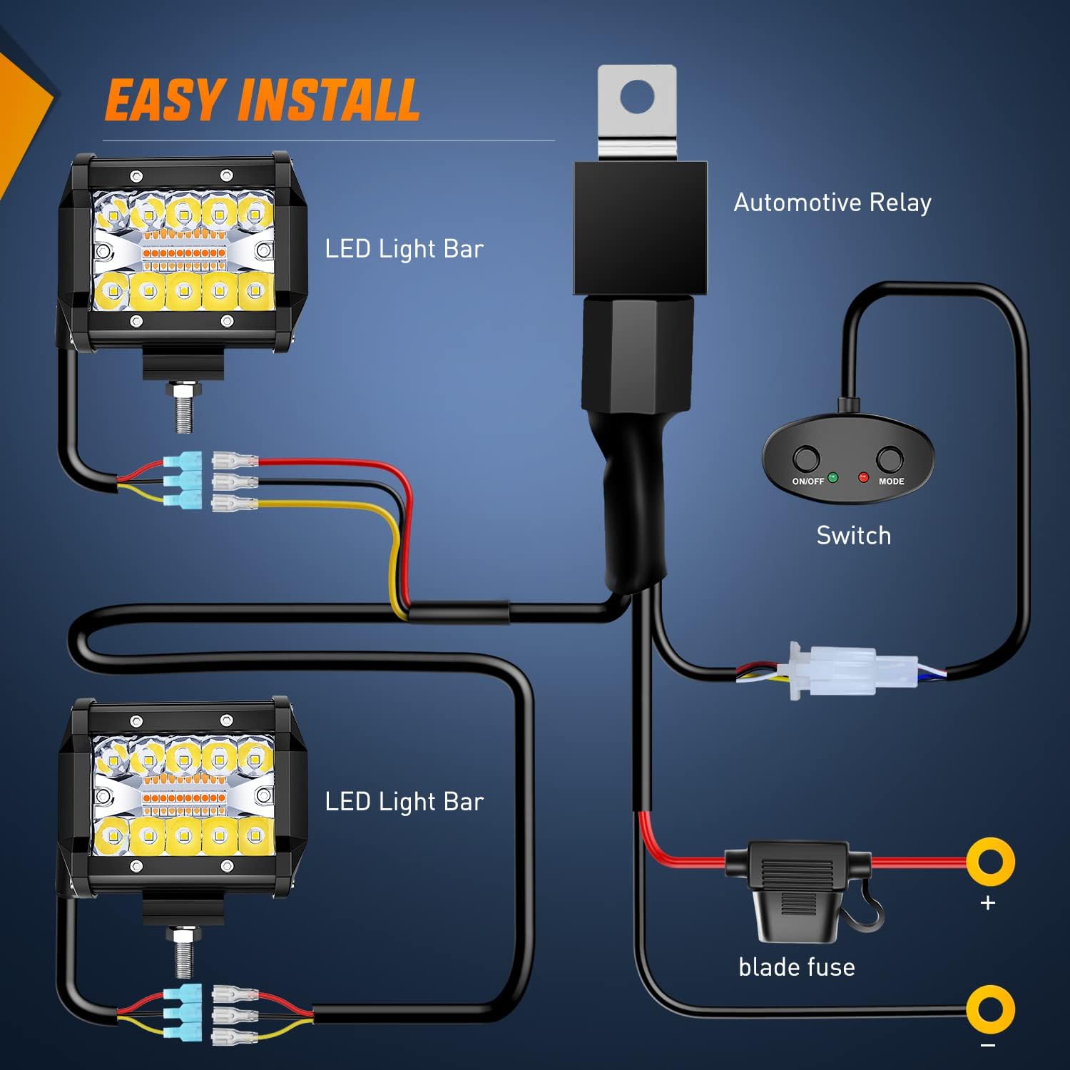 - 6 Modes with Memory Function: Regulate mode in turn by switch of the lights(white/amber/white & amber/white strobe/amber strobe/ white & amber strobe). The light bar will remember the mode you last used, you won't be annoyed by switch-mode frequently. It's great to use for warning lights, fog lights, driving lights, or work lights. Come with NILIGHT upgraded version wiring harness kit