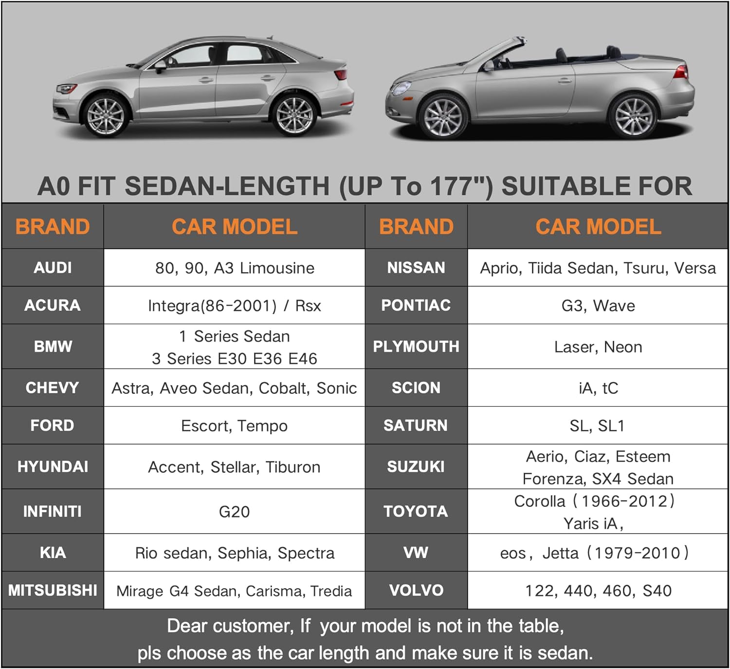 - 【Dimension A0】— Universal fit for sedan which length is up to 177 inch (NOT FOR SUV AND HATCHBACK). Suitable for Nissan Versa/350Z/370Z/200SX/240SX, Audi A3 sedan, Acura Integra/Rsx, Hyundai Accent, Mitsubishi Mirage, Volkswagen eos, Toyota Celica,Chevy Cobalt etc.