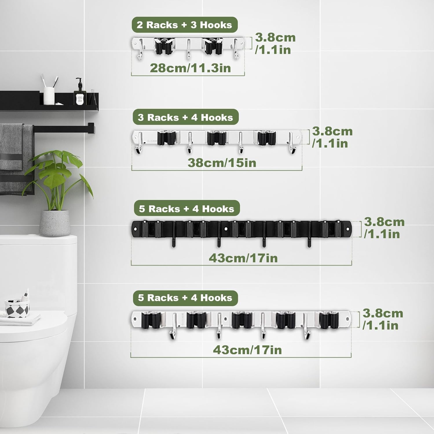 - Organizing & Saving Space: The broom and mop organizer wall hanging with 3 Racks and 4 Hooks organizer your brooms, mops, rakes, garden tools, laundry room storage and more, efficiently uses the wall space. The mop rack provide additional hanging space for miscellaneous items , expanding its life space invisibly.