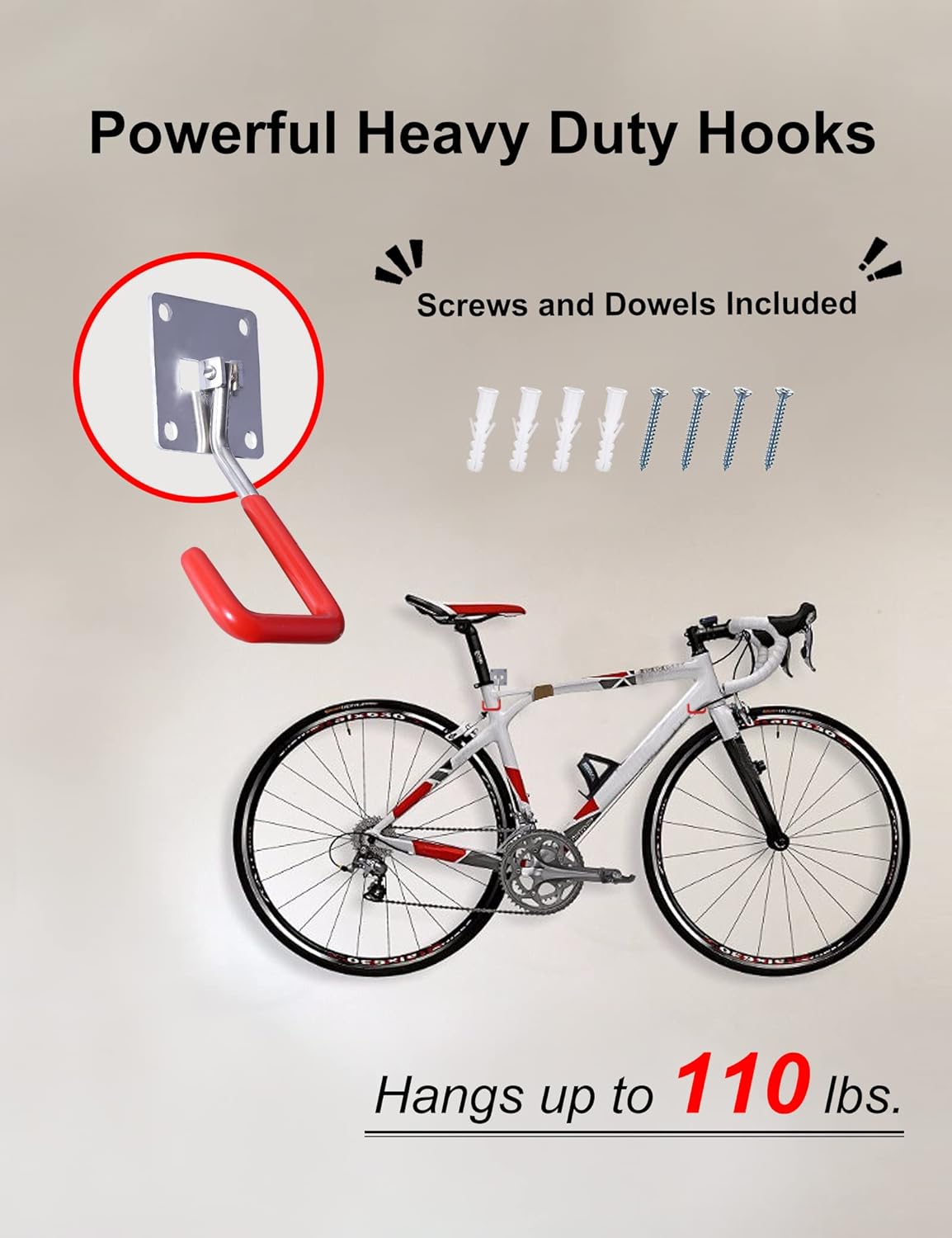 - EASY TO INSTALL: These garage hooks are applicable to all kinds of walls and wood materials and other installation surfaces.Three easy steps: 1) Mark two small holes on the wall; 2) Fix the white plastic anchor to the desired; 3) Twist the steel screw nail into the anchor.