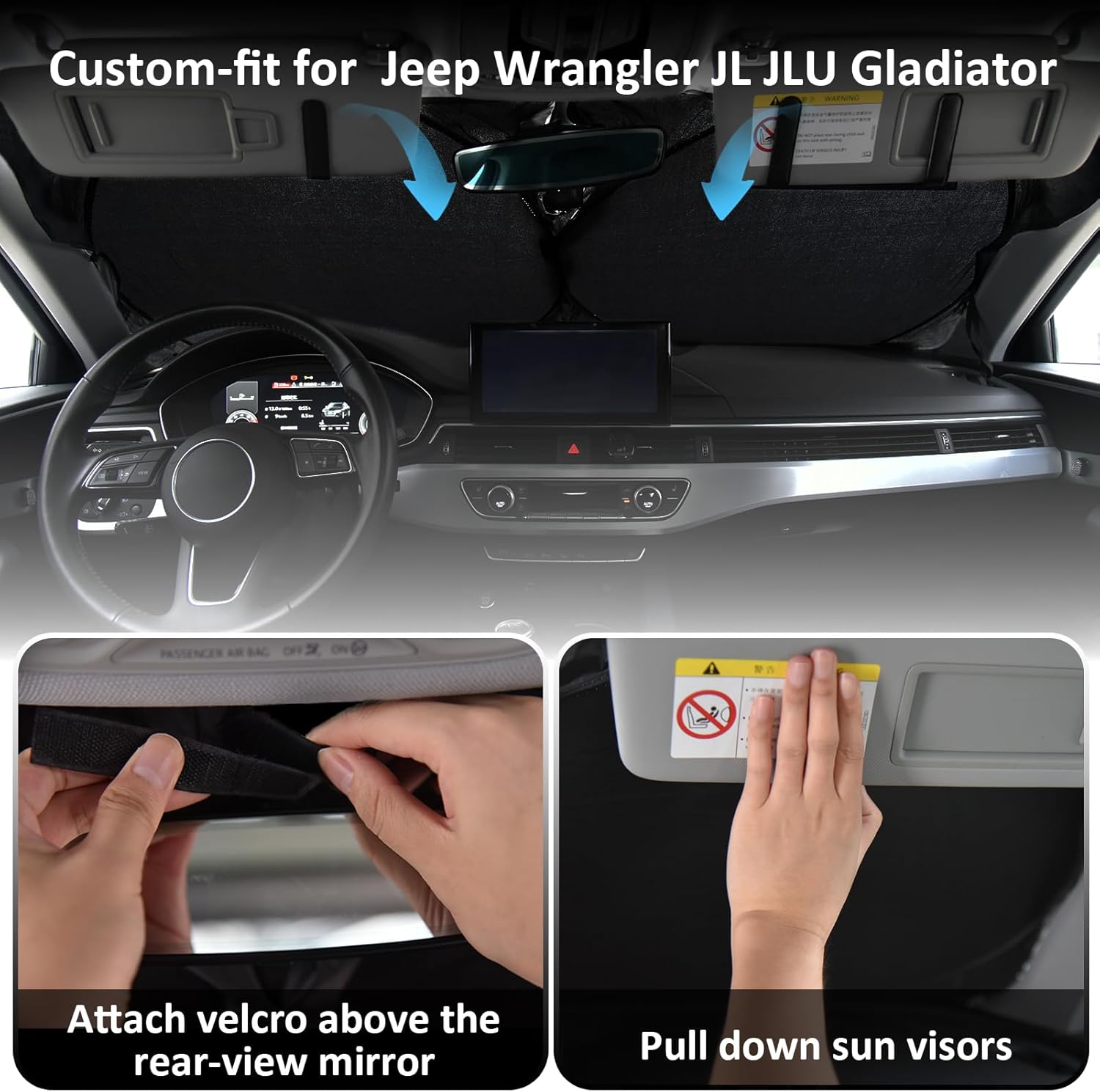 Sunshade Sun Shade for 2018-2024 2025 Jeep Wrangler JL JLu JK JKU Windshield Cover Custom Fit 2020-2025 2026 Jeep Gladiator Front Window Shields Protector 210T Reflective Blocks UV Rays Keep Cool