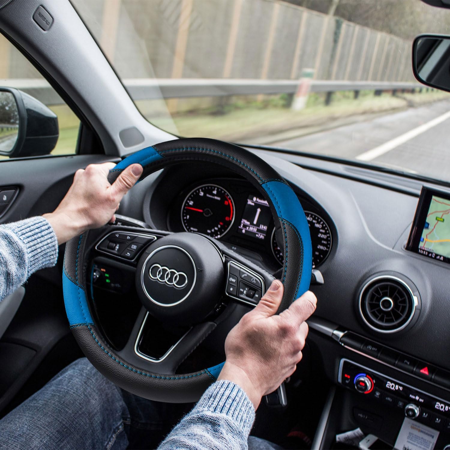 Leather Car Steering Wheel Cover, Non-Slip Car Wheel Cover Protector Breathable Microfiber Leather Universal Fit for Most Cars (Blue-2)