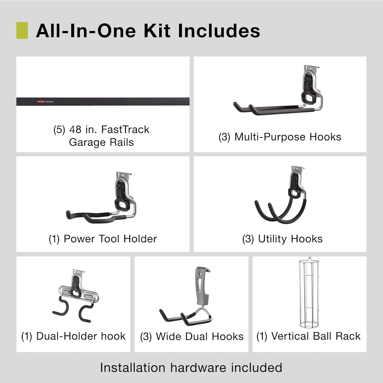 Rubbermaid 20-Piece FastTrack Garage Wall-Mounted Storage Kit 5 Rails and 15 Hooks for Home/House/Tool/Sports/Utility Purposes