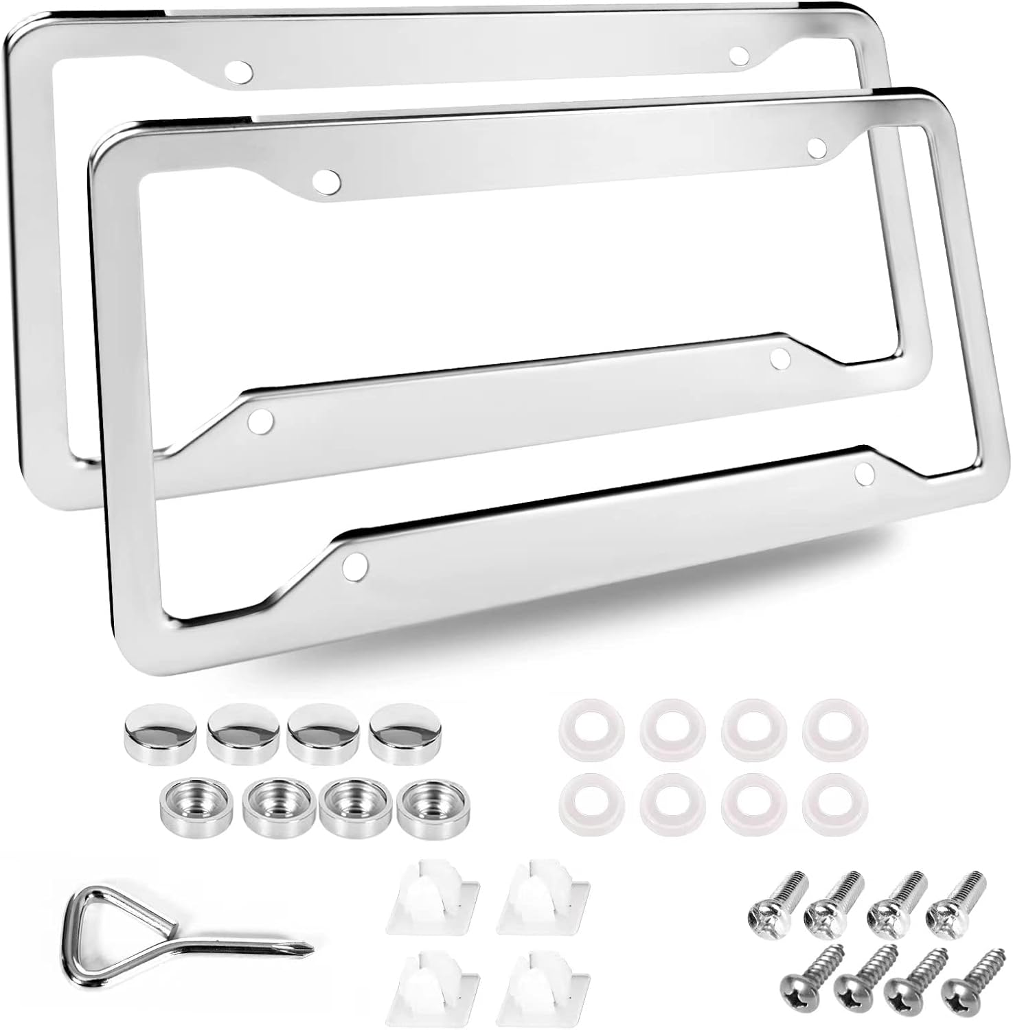 - Package Contents: : 2 pcs License plate frame, 8 screw caps, 4 white nylon Inserts, 8 screws, 8 washers (plastic), 1 screwdriver