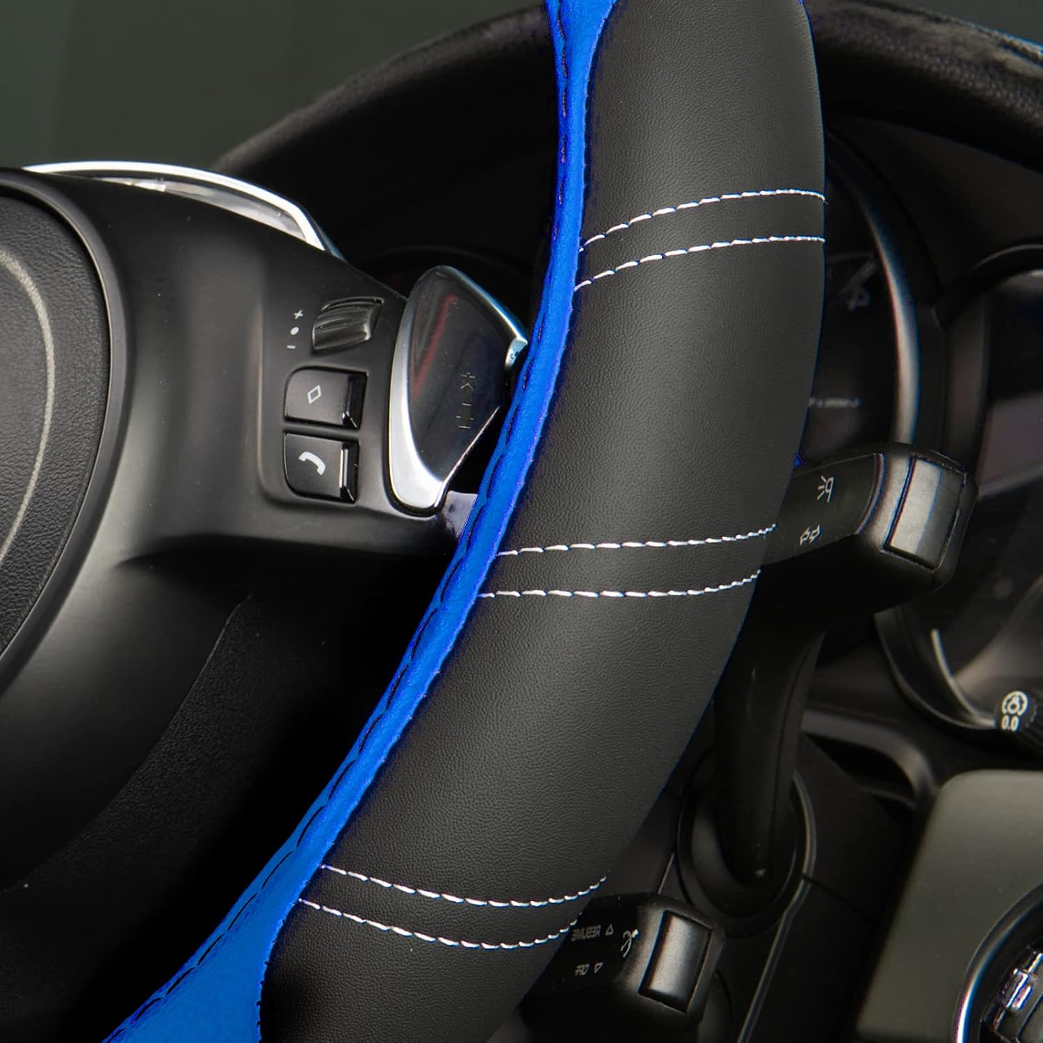 CAR PASS Line Rider Microfiber 14 Inch Leather Sporty Steering Wheel Cover Universal Fits for Truck,SUV,Cars, Anti-Slip Safety Comfortable Desgin (Black-Blue)