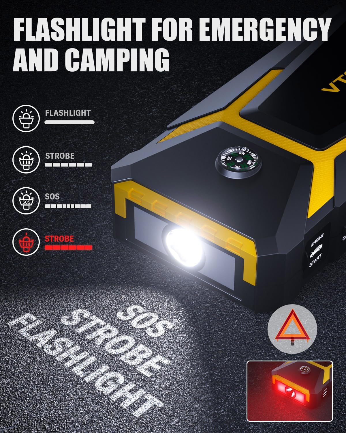 - Designed Specifically For Your Travels - Equipped with a built-in LED flashlight offering 4 modes (flashlight, SOS, strobe, red emergency light), the vehicle jump box with Universal Fit also includes a built-in compass for your travels.
