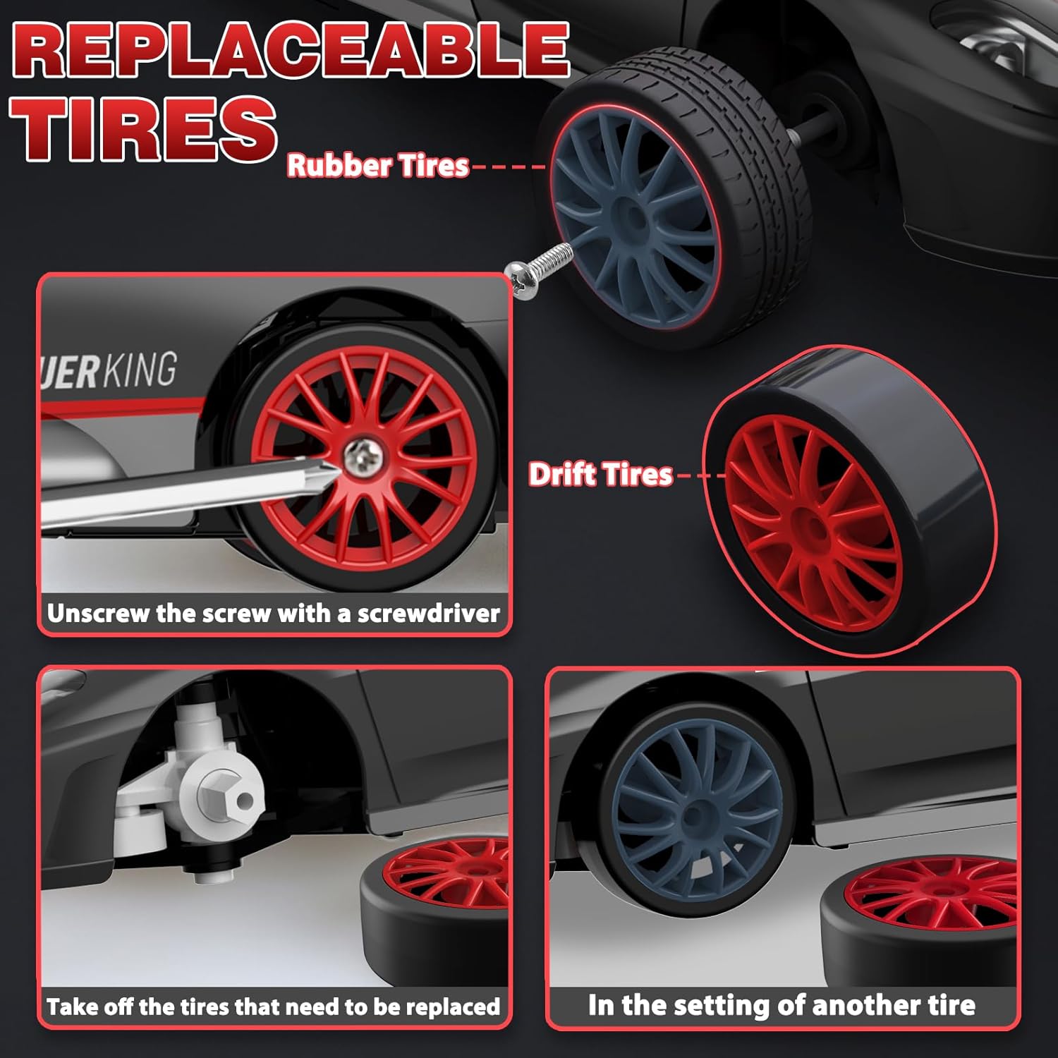 - Rechargeable Fast Car: Full function RC drift car with two rechargeable batteries. Don't worry about being out of charge anymore; Forward, reverse, left/right turn, front LED lights, U shaped drift, fiqure 8 drift, all-wheel drive