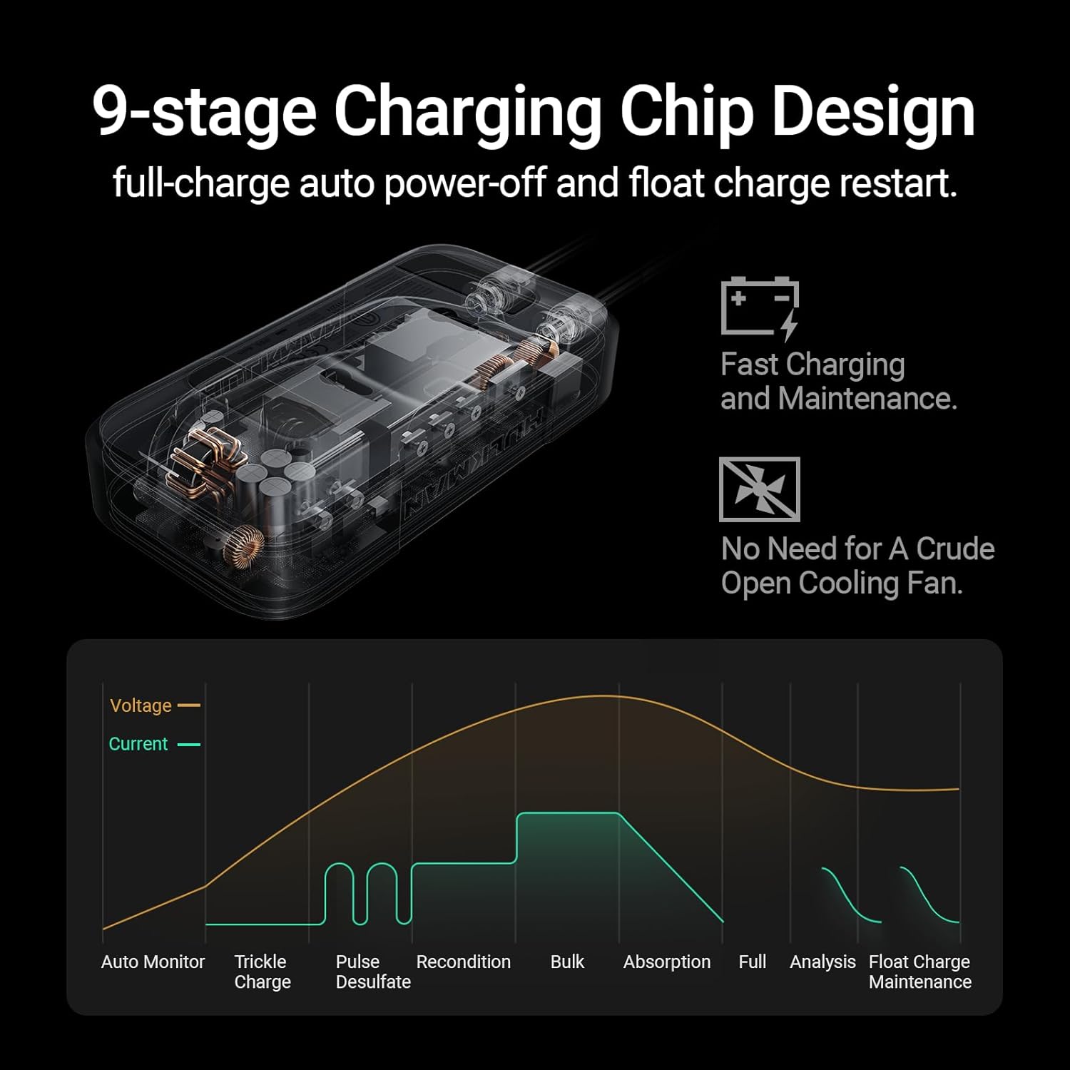 - 9-stage Charging, Temperature Control: This smart charger adjusts charging stages automatically. It works as trickle charger and batteries maintainer. New steps enable full-charge auto power-off and float charge restart. No worry about overcharging, overheating