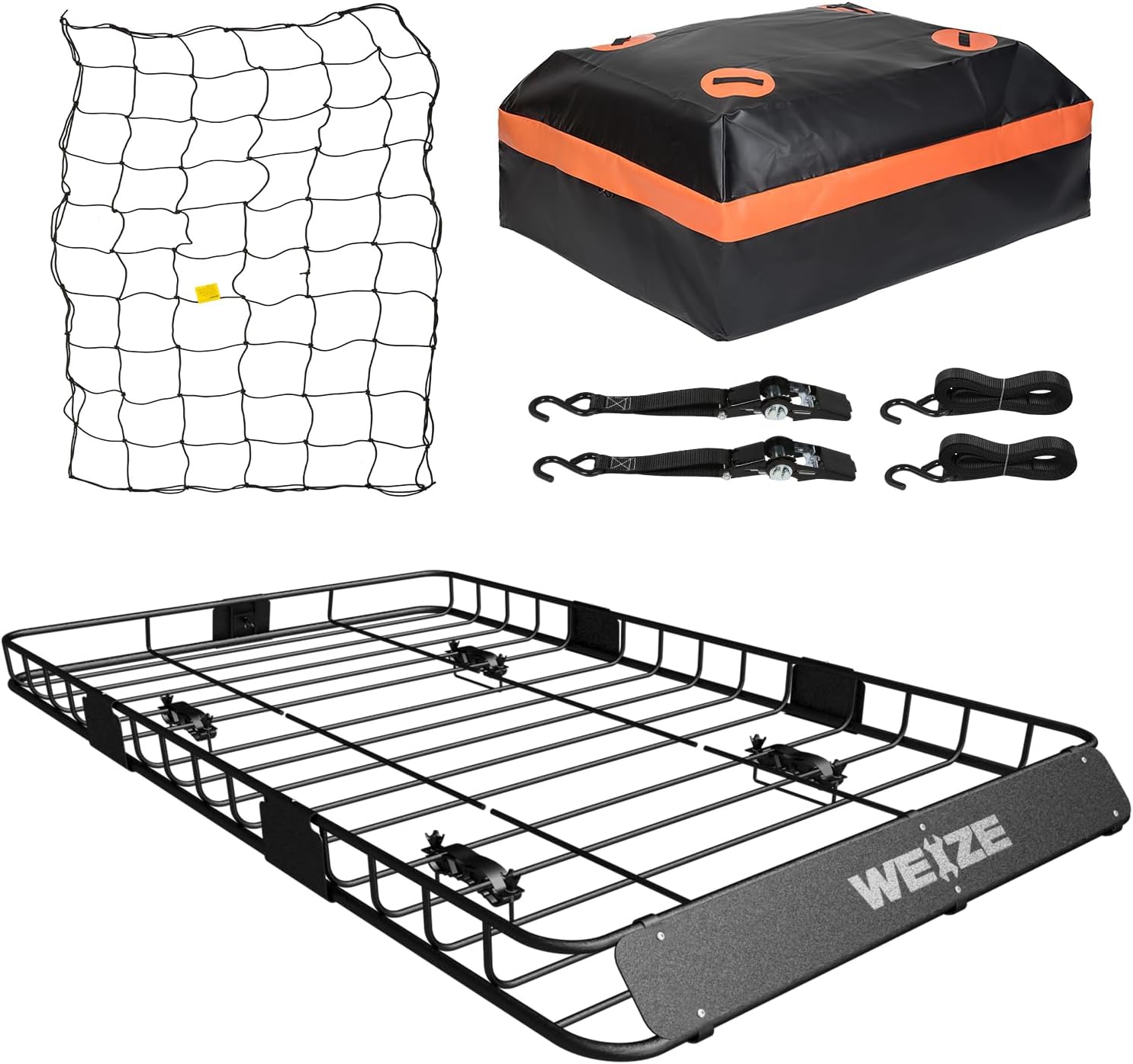 WEIZE 54" x 34" Heavy Duty Roof Rack, Rooftop Cargo Carrier Basket with Waterproof Bag, Tie Down Strap, Net, Rack Extension and Car Top Luggage Holder for SUV, 200lb Capacity, Steel Construction