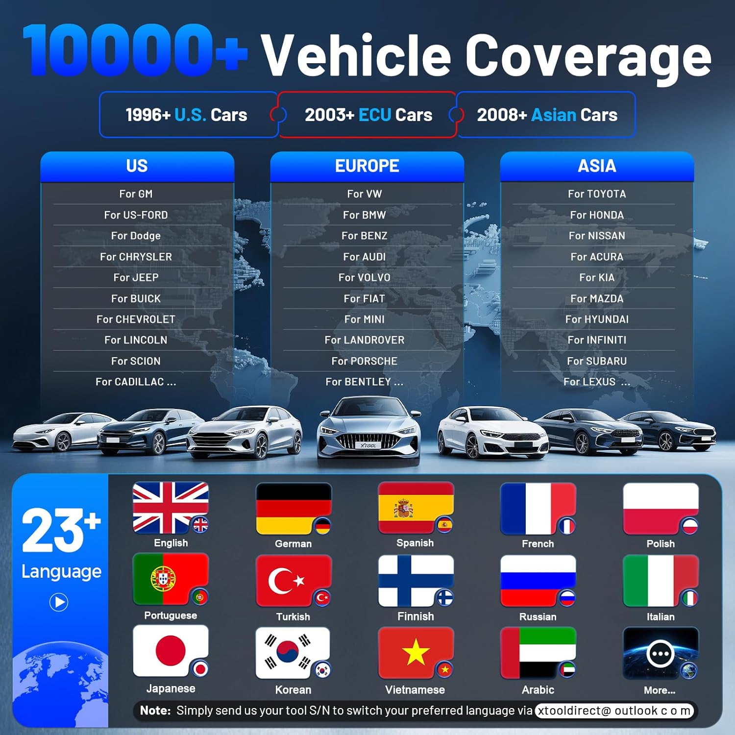 - 10000 Vehicles Coverage, 23 Languages, CANFD&DoIP: XTOOL Scanner IP616 scan tool works globally on US, European, Asian, Australia cars, covers 10000+ models and more growing!! It supports 23 languages breaking down language barriers, with CAN-FD/DoIP protocol intended for GM 2020+ cars and for BMW/for Land Rover/for Jaguar cars. Note: Not all vehicles and functions are supported, please send XTOOL car VIN and required functions to check the compatibility before purchase