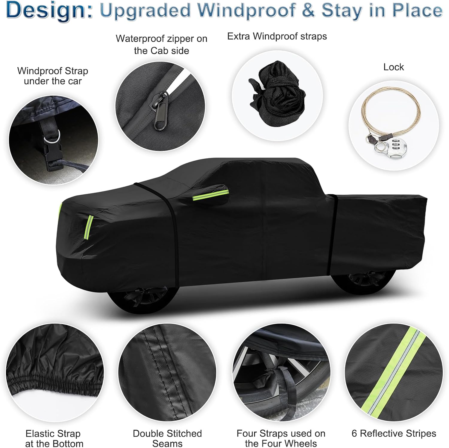 - 【Designs with Zipper】A zipper on the cab side for convenience. UV protection and heat-proof .5 Reflective Strips attached on the front DRL lamps, middle Turning lights and Rear taillight.It comes with four straps,a windproof buckle, a security lock and a storage bag.Double-stitched & Waterproof Strip make the cover better waterproof.