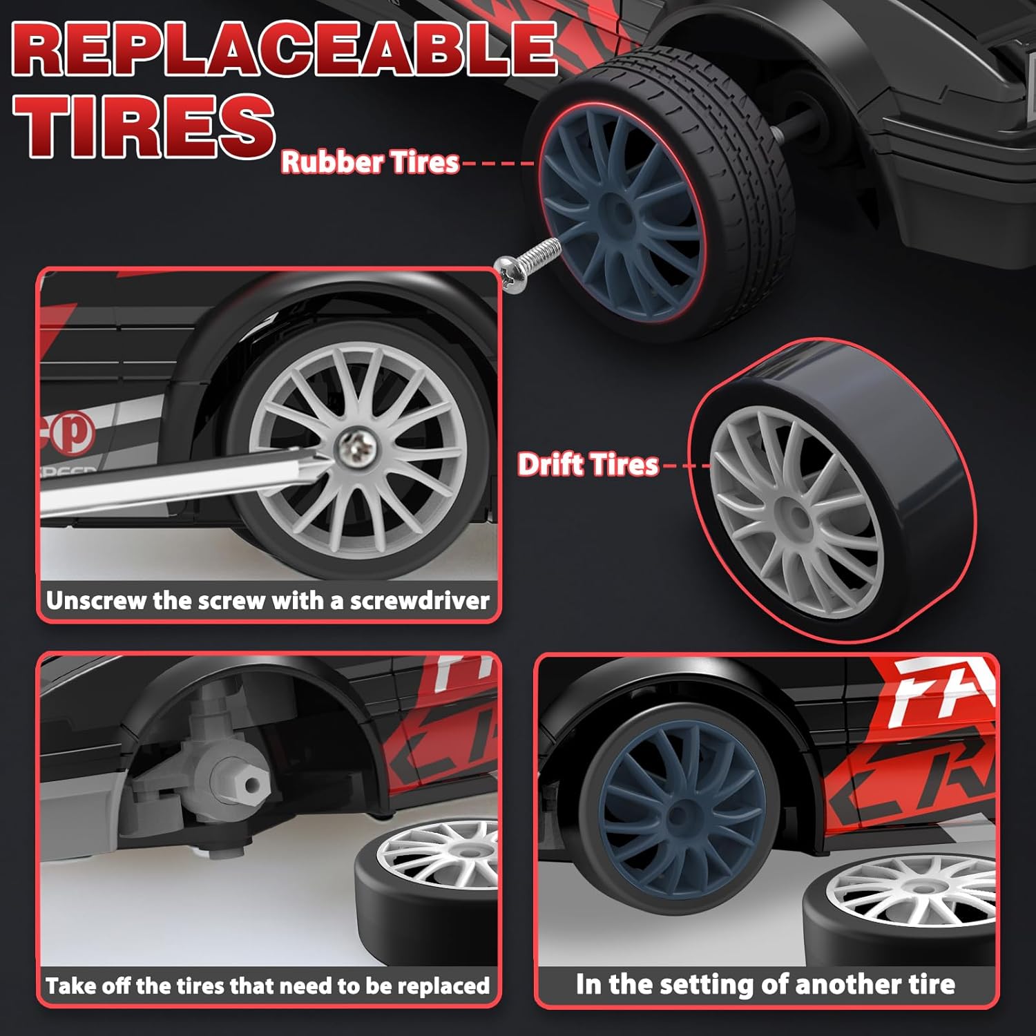 Remote Control Car 1/24 2.4GHz 4WD RC Drift Car, High Speed Drifting RC Cars with Cool Lights, Two Batteries and Extra Tires Toy Cars for Kids Boys Girls Adults, Black