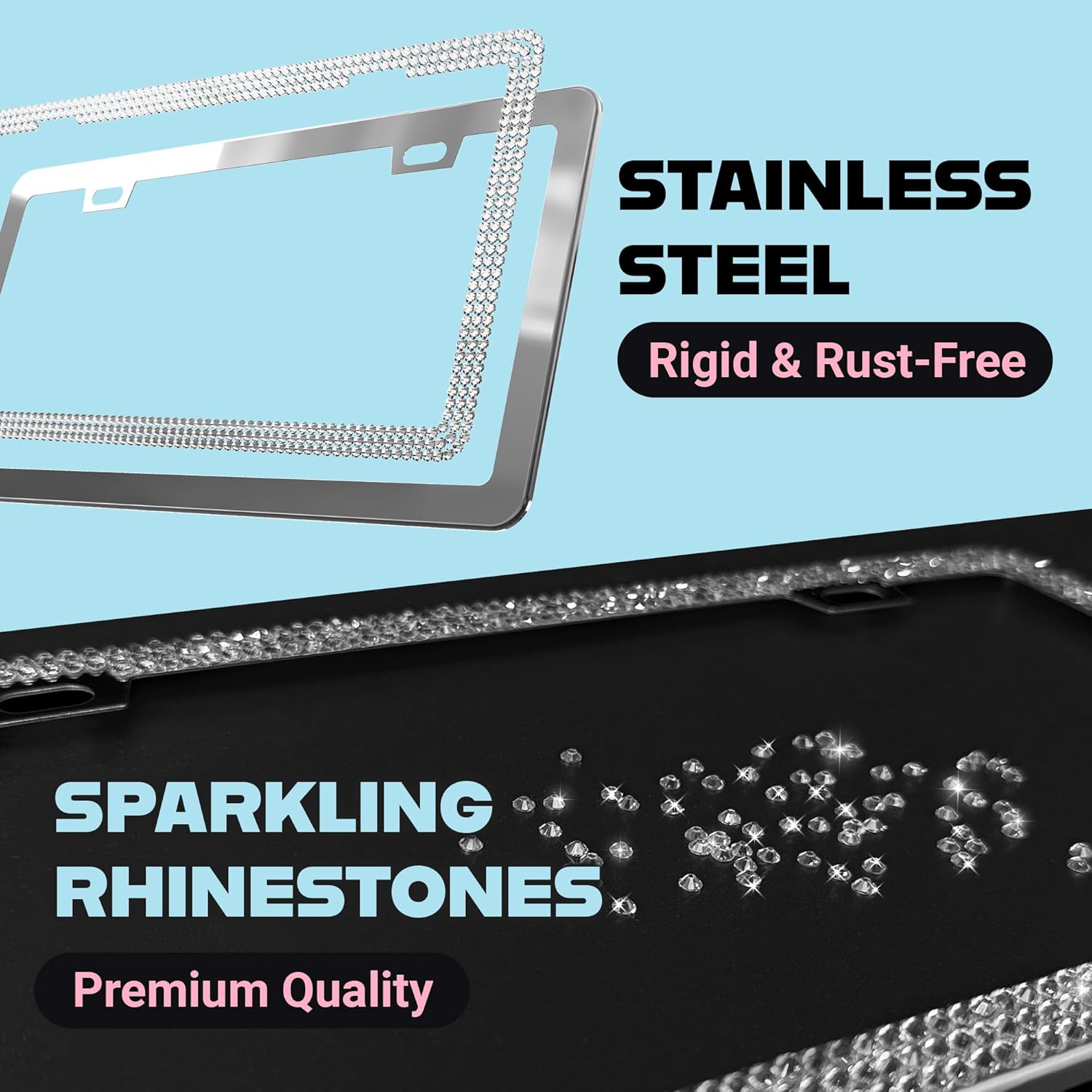 Dazzling Bling License Plate Frame for Women - 1 Pack, 800 Premium Rhinestones, Rust-Free Stainless Steel, Street Legal Slim Design, Sparkly Diamond Car Tag Holder with Glitter Crystal Screw Covers