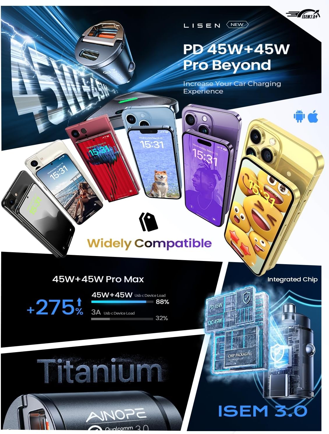 - QC45W+PD45W Super Fast Charger: AINOPE USB C fast car charger which has dual ports PD 3.0 (45W) & QC 3.0 (45W) to optimize charging speed. Maximize the charging speed of your device.This samsung galaxy s25 ultra car charger makes the Samsung Galaxy S24 Ultra charging time from 0% to 92% in 30 minutes.This car fast charger usb c for iPhone 15 16 has been recognized by official USB-IF and Qualcomm and passes over 16 tests, allowing you to power your devices confidently.