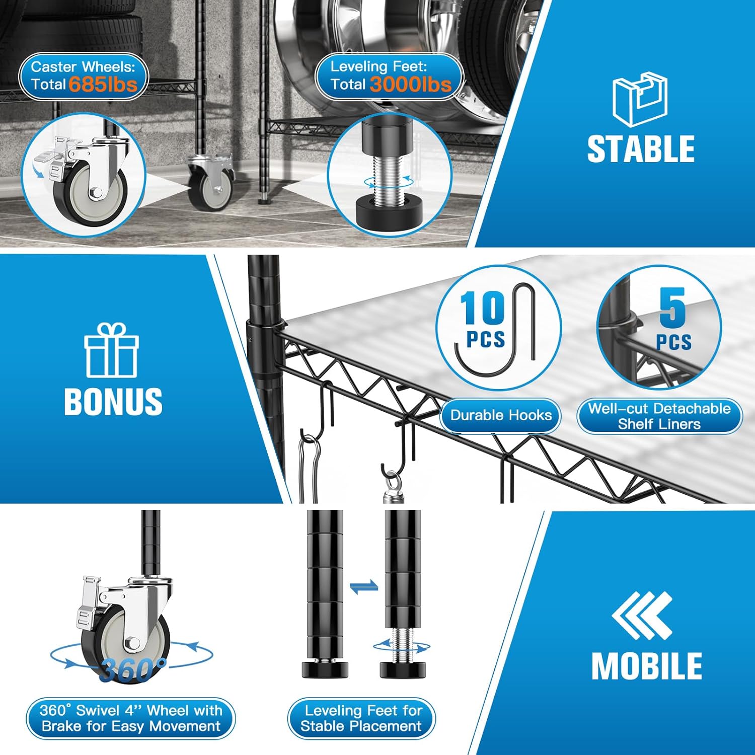 Wire Shelving with Wheels, 48x18x72 Inch, 3000 Lbs Storage Shelves Heavy Duty, Commercial-Grade Adjustable Utility Shelf, NSF-Certified Metal Storage Rack with Shelf Liners, 5-Tier, Matte Black