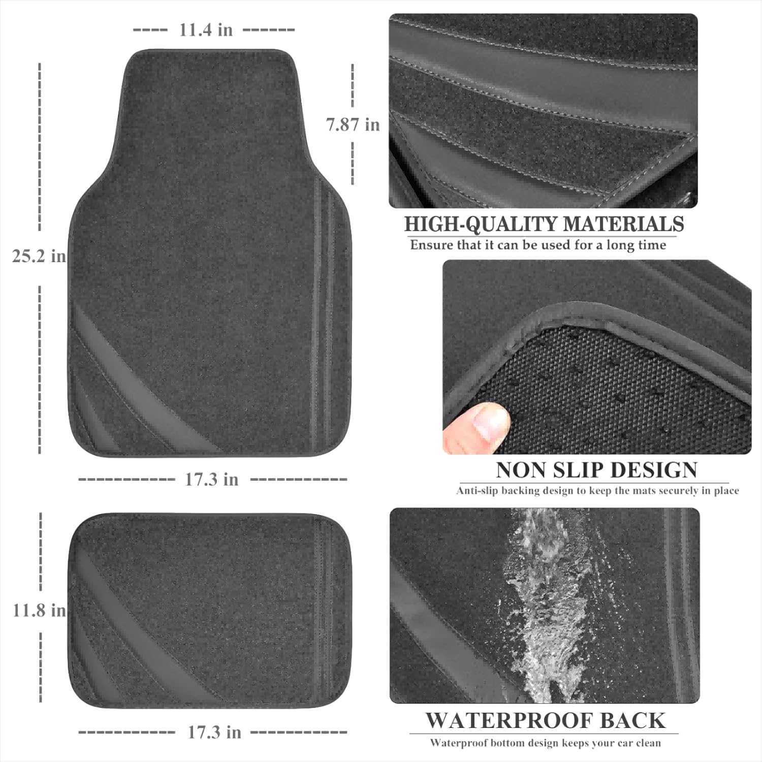 - Universal Fit- Shape and Size is Engineered to Fit Most Cars, Trucks, Vans and SUVs. Front (25.2"L x 17.3W) Rear (11.8"L x 17.3"W). Package Included: 2 front floor mats and 2 rear floor mats.