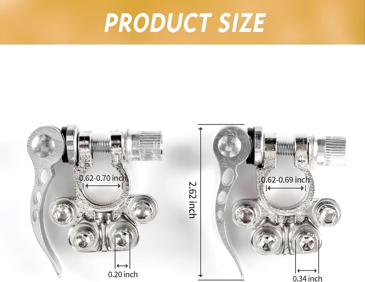 - Size:For wires diameters 5.2 - 7.4mm (AWG gauges 1 - 4). Minimum wire size: 16mm (5/8"). Max wire clamp: 9.5mm/0.37in, mini wire clamp: 6.5mm/0.25in. Positive inner diameter: 17.5~19.1mm, negative inner diameter: 15.9~17.5mm.