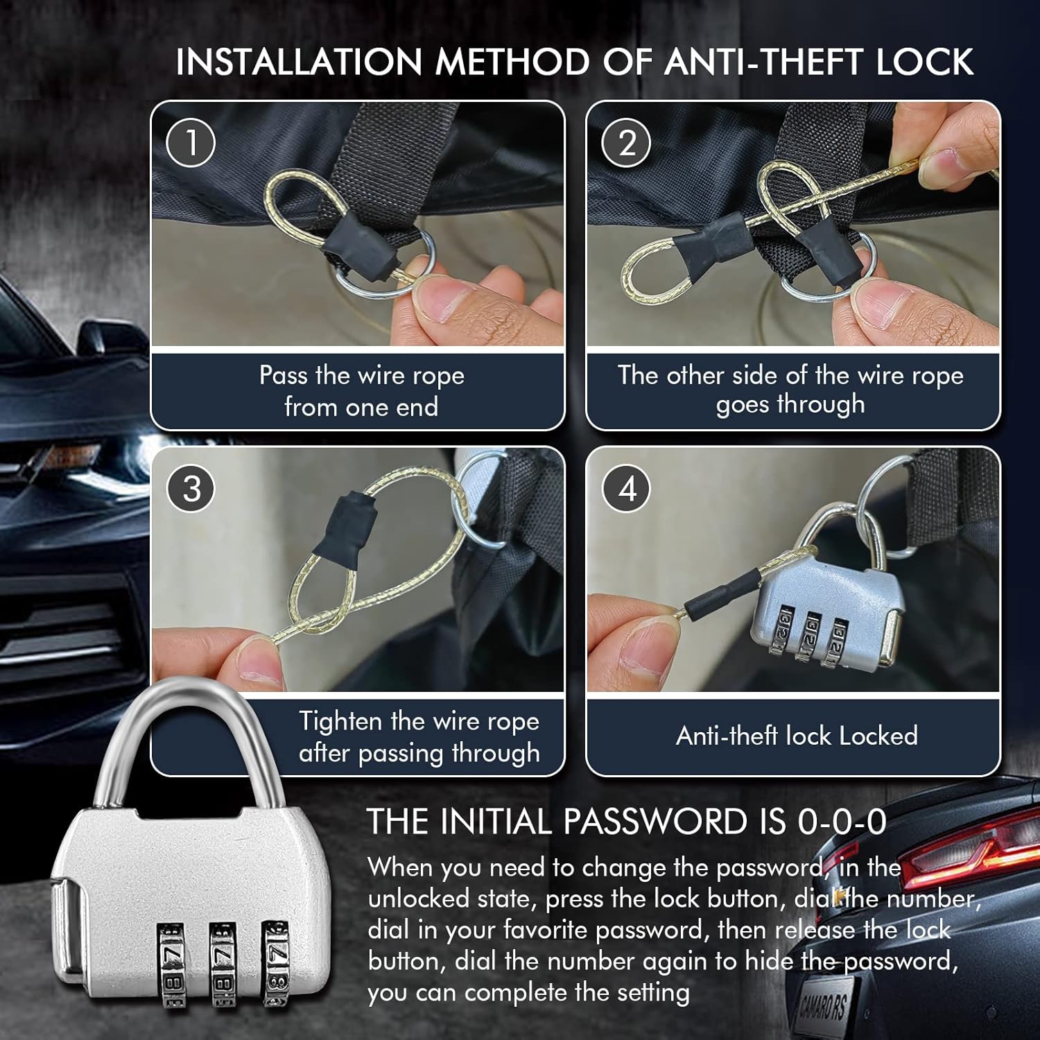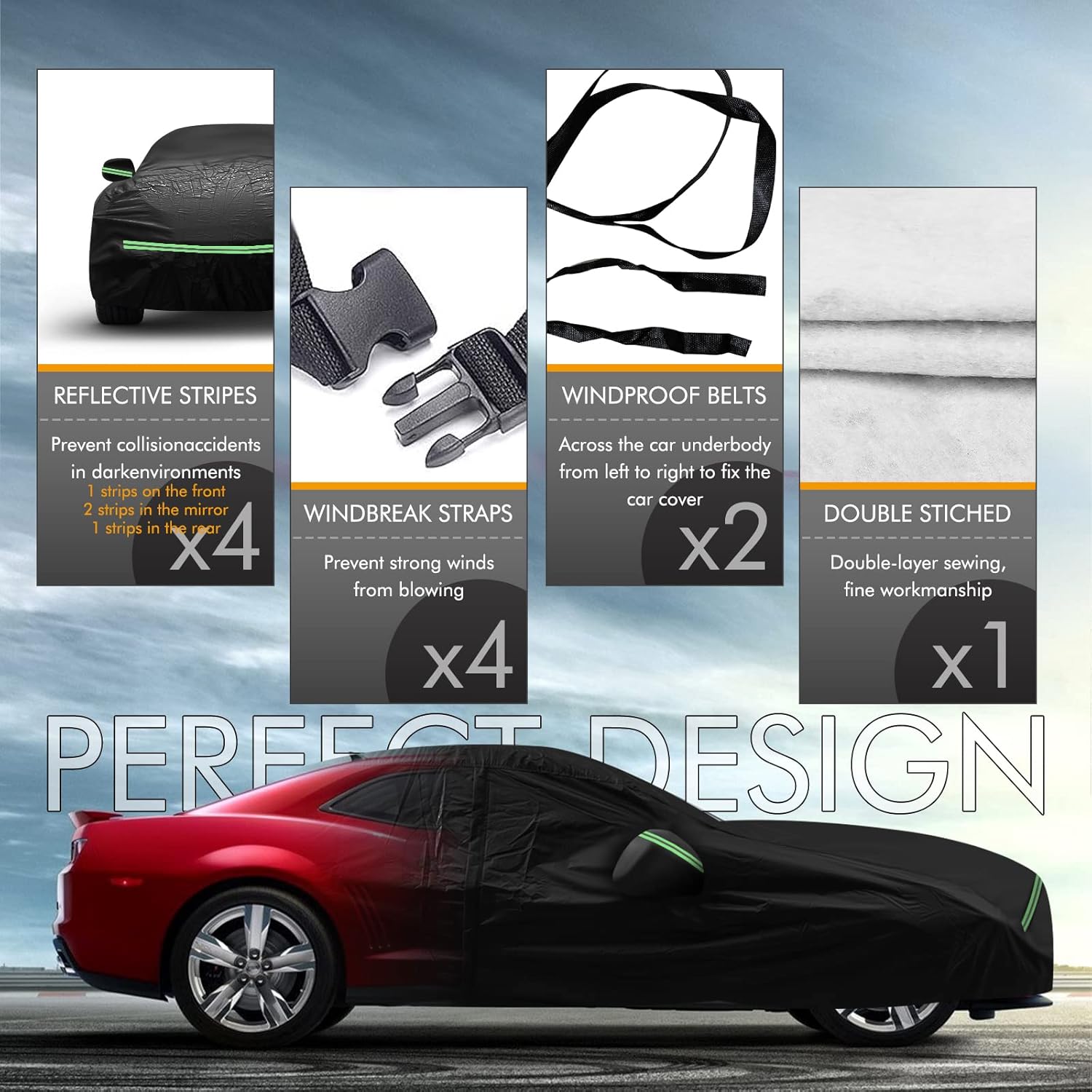 - 🚙【Upgrade Windproof Design】①A windproof fixed buckle pass through the middle of the car for easy fixing; ②2 windproof belts at the front and rear; ③4 straps to tie the cover to the four wheels; ④Elastic band at the bottom can easily adjust the size of the cover; ⑤Double stitching ensures that the cover will not tear easily, making it more durable; ⑥The included safety latch secures the cover. Multiple upgraded designs keep your protective cover from being blown away even in strong winds.