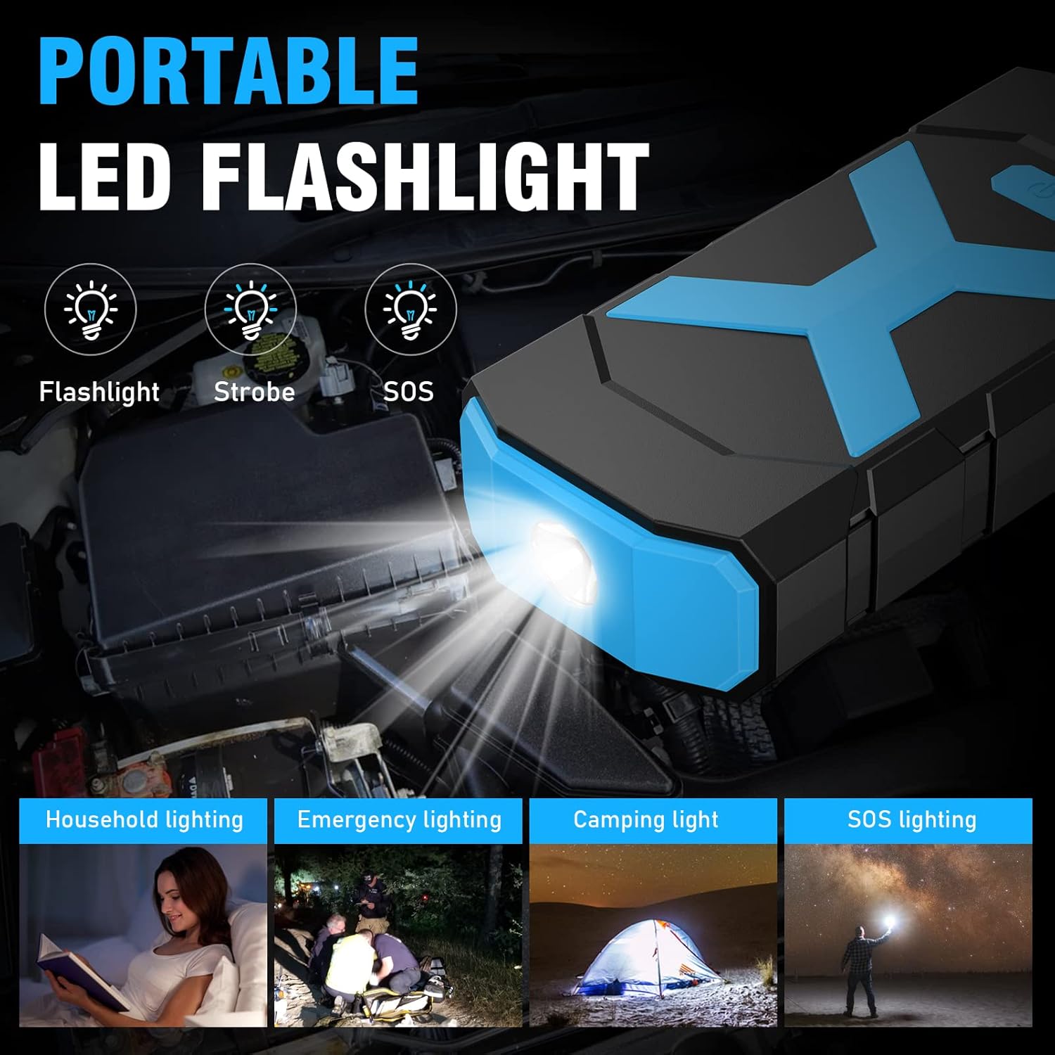 - 3 LED LIGHT MODES FOR EMERGENCY - Not just a 12V lithium battery booster, it has 3 LED light modes: Flash Light, Strobe Light, and SOS. This multi-purpose flashlight comes in handy in case of picnic, travel, emergency and outdoor adventures