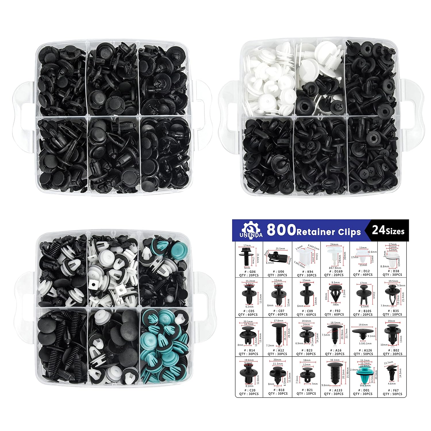 - UNIVERSAL AUTOMOTIVE CLIPS KIT: 801 PCS great assortment push retainer kit-24 most popular size, with 1 Blue Fastener Remover, fitting for door trim, radiator shield yoke, fender, bumper, side skirt, grille, engine cover and splash shield retainers replacement,compatible with Ford, GM, Chrysler, Toyota, Honda and more