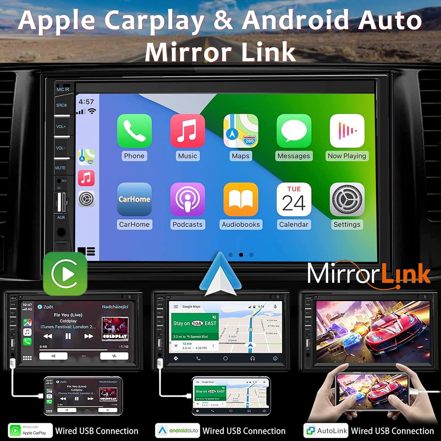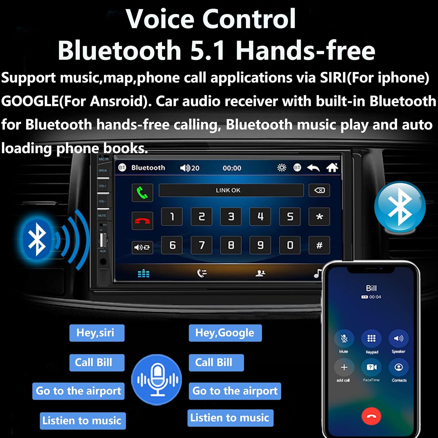 - 【Car Stereo with Carplay & Android Auto】This car stereo double din radio compatible with Apple Carplay and Android Auto which allows you to get voice control, Siri/Google assistant help you access the your phone functions including calls, map navigation, email, music, messages, etc. while you stay focused on the road. With voice Assistant, help you focus on the road and have fun along the way.