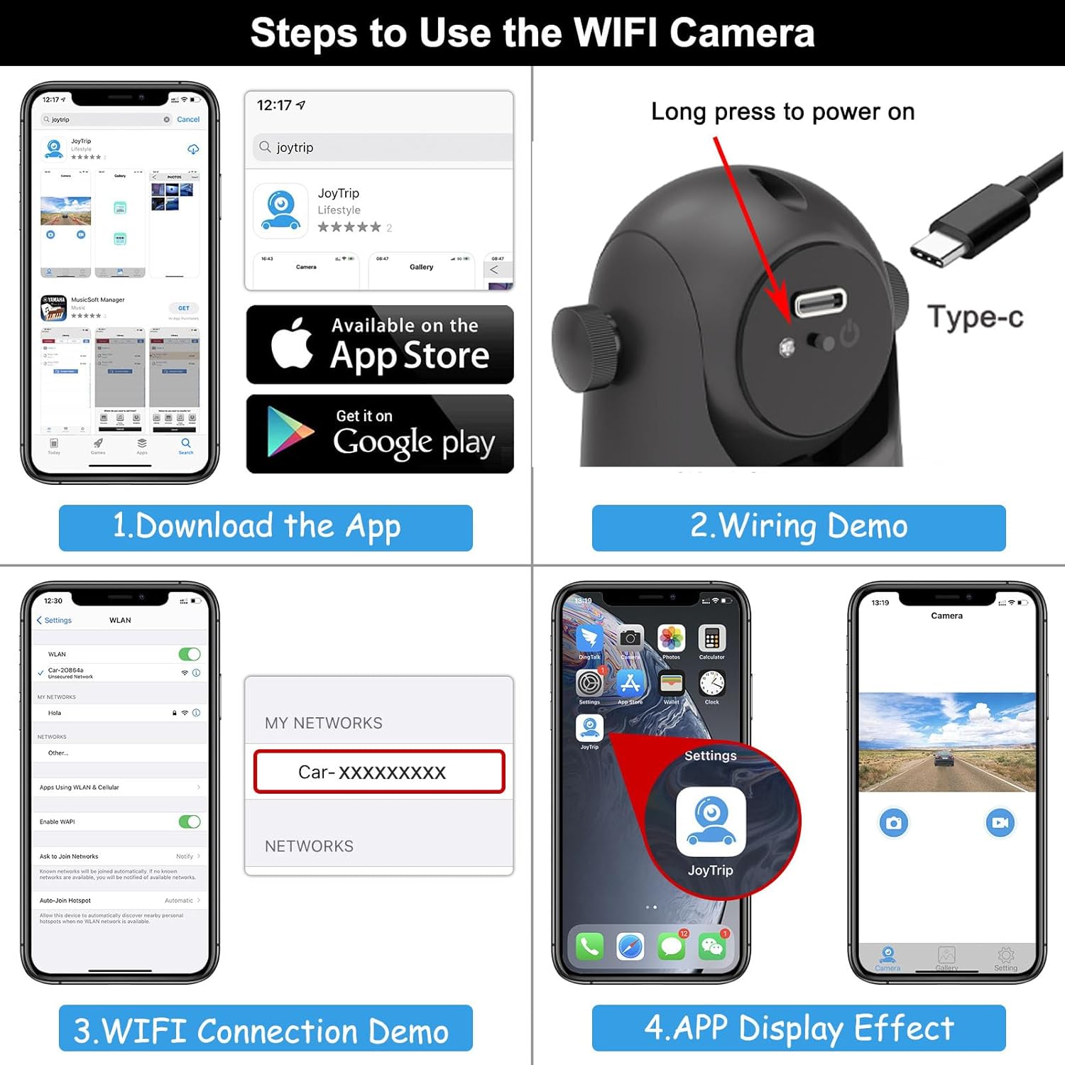 - 【Real-Time Front / Rear View】Back up camera can be installed in front of or behind the car to allow obstructions on the trail to be easily seen, with the live front / Rear view showing directly on your mobile device, allowing you to see the camera view on your smartphone/tablet. And you can record or playback important video clips at any time