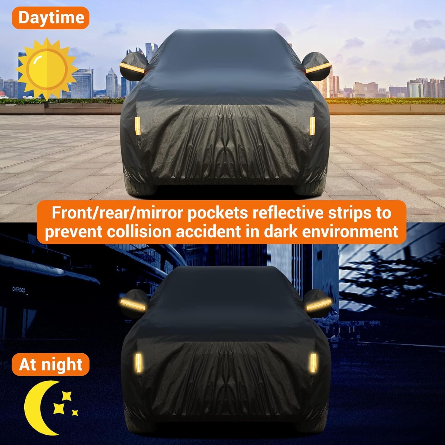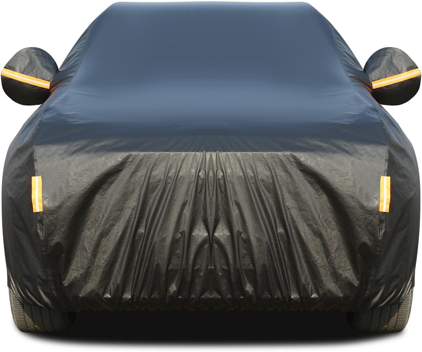 - 360°All-round Protection: Full exterior covers Protect your vehicle from scratches and dents, sun, rain, snow, rain, frost, bird droppings, sand, dust, leaves, industrial pollution and more with a waterproof all-weather car cover. Black SUV car cover is stain-resistant and easy to clean, and the breathable material improves airflow and reduces condensation while covering.