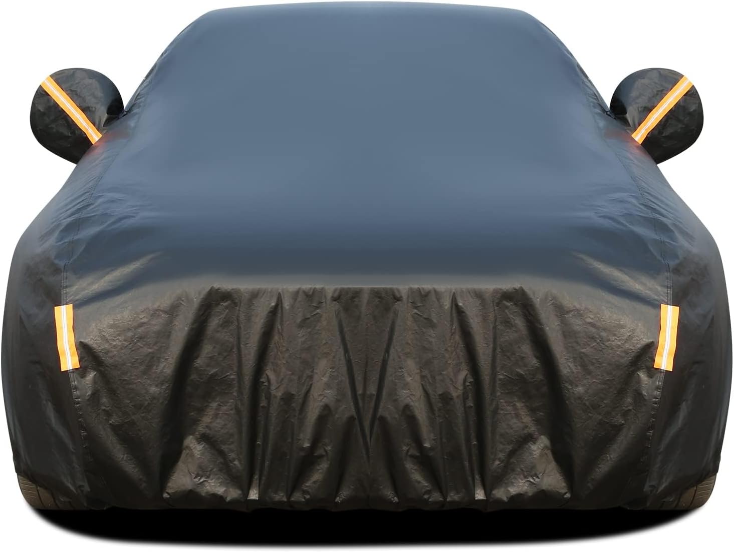 - 3-layers Premium Material: Car cover sedan is made of high-density 190T multi-layer thick composite material. 1. Anti-UV and sun protection in highly reflective aluminum keeps your Sedan cool while preventing fading and prolong the service life. 2. PE&PEVA 100% waterproof, rainproof, snowproof, hailproof. 3. Thick and soft fleece lining to protect the car paint.