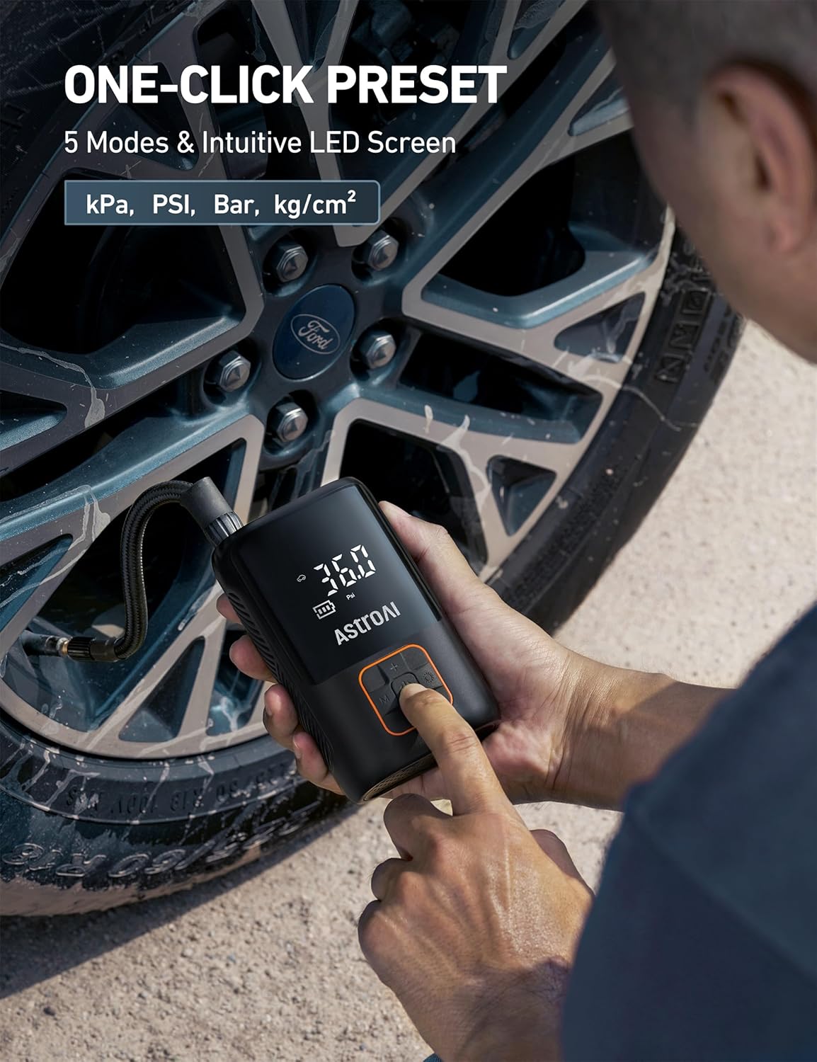 - Realtime Large LCD & Smart Preset: The air compressor is equipped with a large LCD screen that simultaneously displays the current and preset pressure. Monitor tire pressure in real time with intuitive readouts and easy inflation. Includes four smart preset inflation modes: bicycle, motorcycle, car, ball, and custom mode; easy operation. Automatically shuts off when it reaches the preset value. No worrying about over inflation, smart and efficient. Four units to choose, PSI、KPA、BAR、KG/CM².