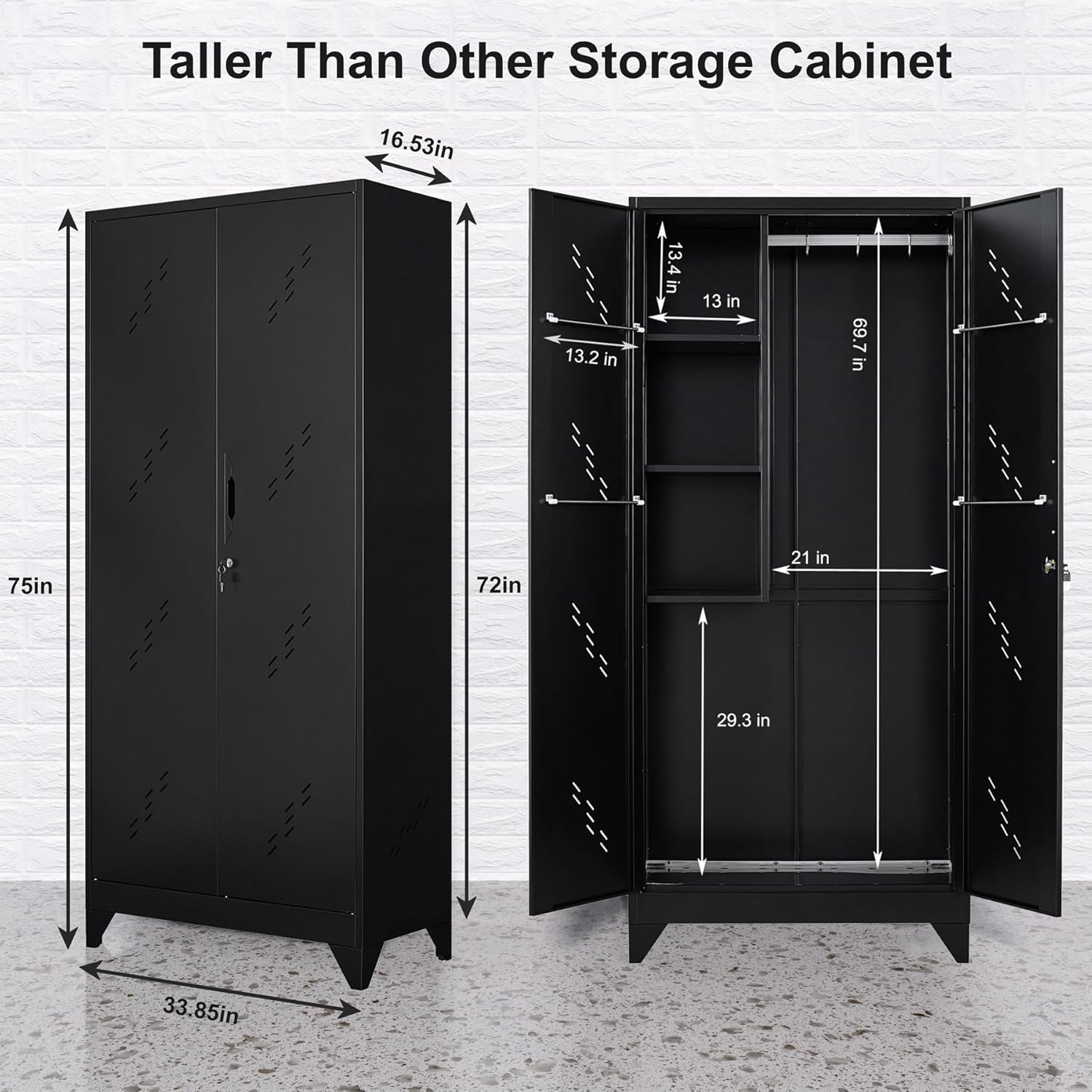 - Multi-scene Multi-purpose:Why choose our storage cabinet? 𝗢𝗡𝗘:75" tall , taller than other metal cabinet. 𝗧𝗪𝗢: Higher vertical space to store large items, such as mops, brooms, fishing rods, buckets, shovels, etc. 𝗧𝗛𝗥𝗘𝗘: There are 10 ventilation holes on the cabinet to keep the inside dry. 𝗙𝗢𝗨𝗥: Stainless steel leaky holes at the bottom, anti-rust. 𝗙𝗜𝗩𝗘:Locker with 2 keys.You can use it in the office storage room, garage, home, warehouse,laundry room storage,storeroom.