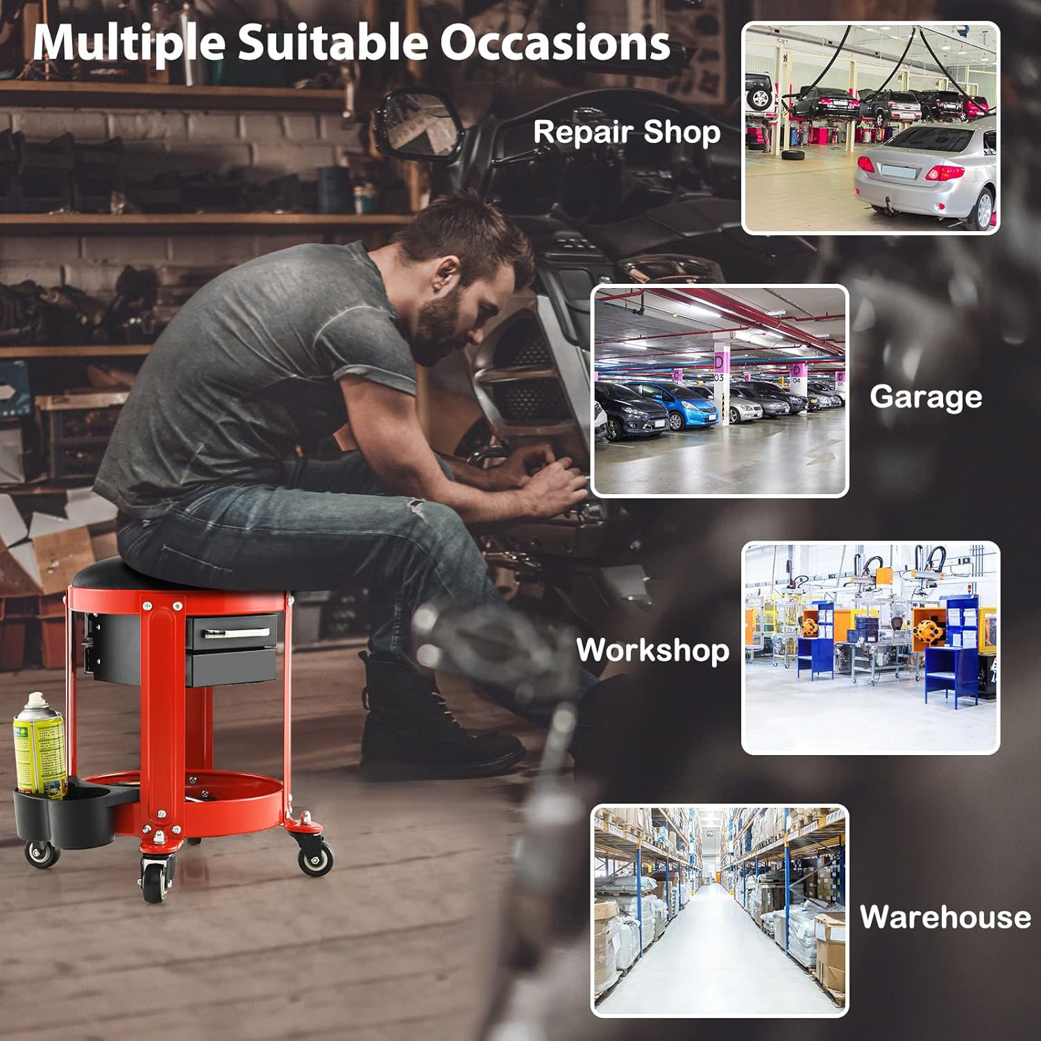 - 🛠️【Wide Range of Application】 This mobile mechanic stool is equipped with 4 universal wheels, making movement much easier and more flexible. Also, the seat cushion can be removed as you need, satisfying more of your demands. Therefore, it's a perfect addition to workshop, garage, repair shop, warehouse and so on.
