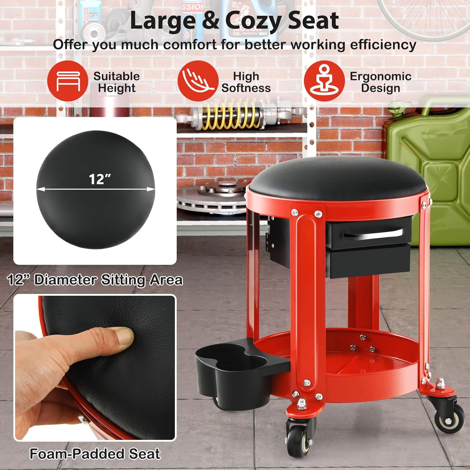 - 🛠️【Spacious & Cozy Seat】 With 12" diameter sitting area and foam-padded design, our safstar round roller seat will offer you much comfort for better working efficiency. And the rolling work seat is in 17" suitable height, which is ideal for most kinds of repairing work.