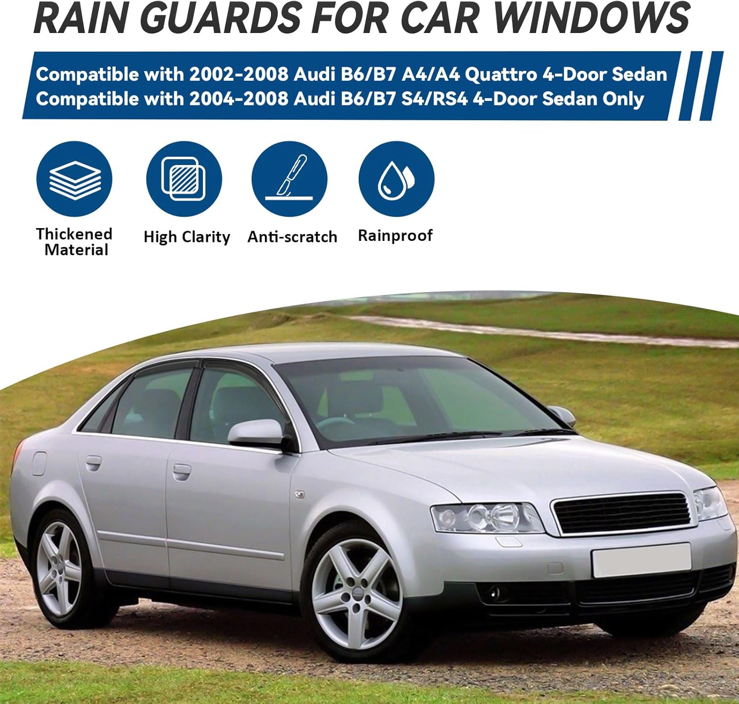 4pcs Front+Rear Smoke Tint Sun/Rain Guard Outside Mount Tape-On Vent Window Visors Compatible with 02-08 B6/B7 A4/A4 Quattro 04-08 S4/RS4 4-Door Sedan