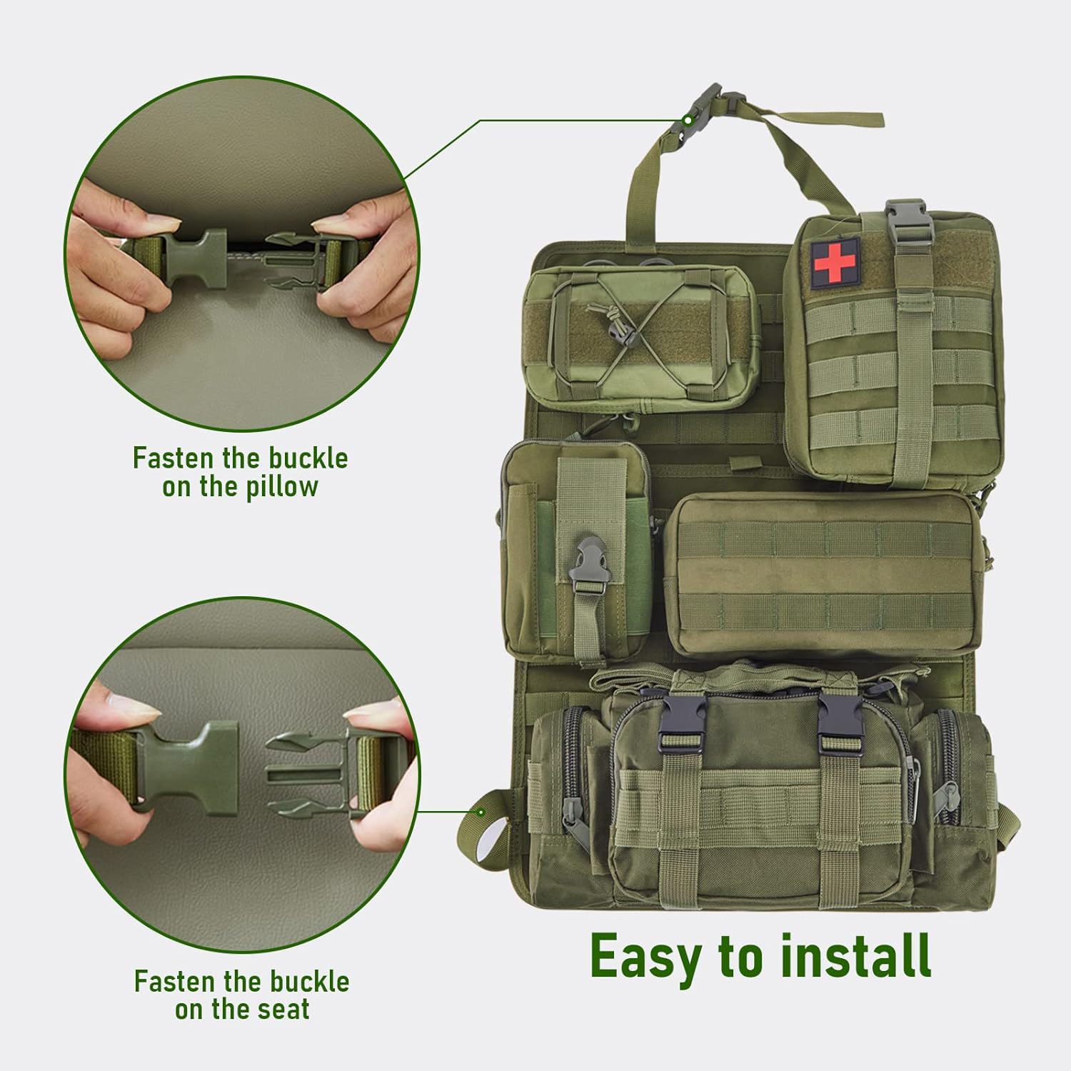 - ๐ Easy Installation - With adjustable strap,easily adjust to fit around your headrest and at the bottom between the seat back and base.Each Molle bags has been designed with velcro tape and buckle, each pouch is flexible to be added or removed.