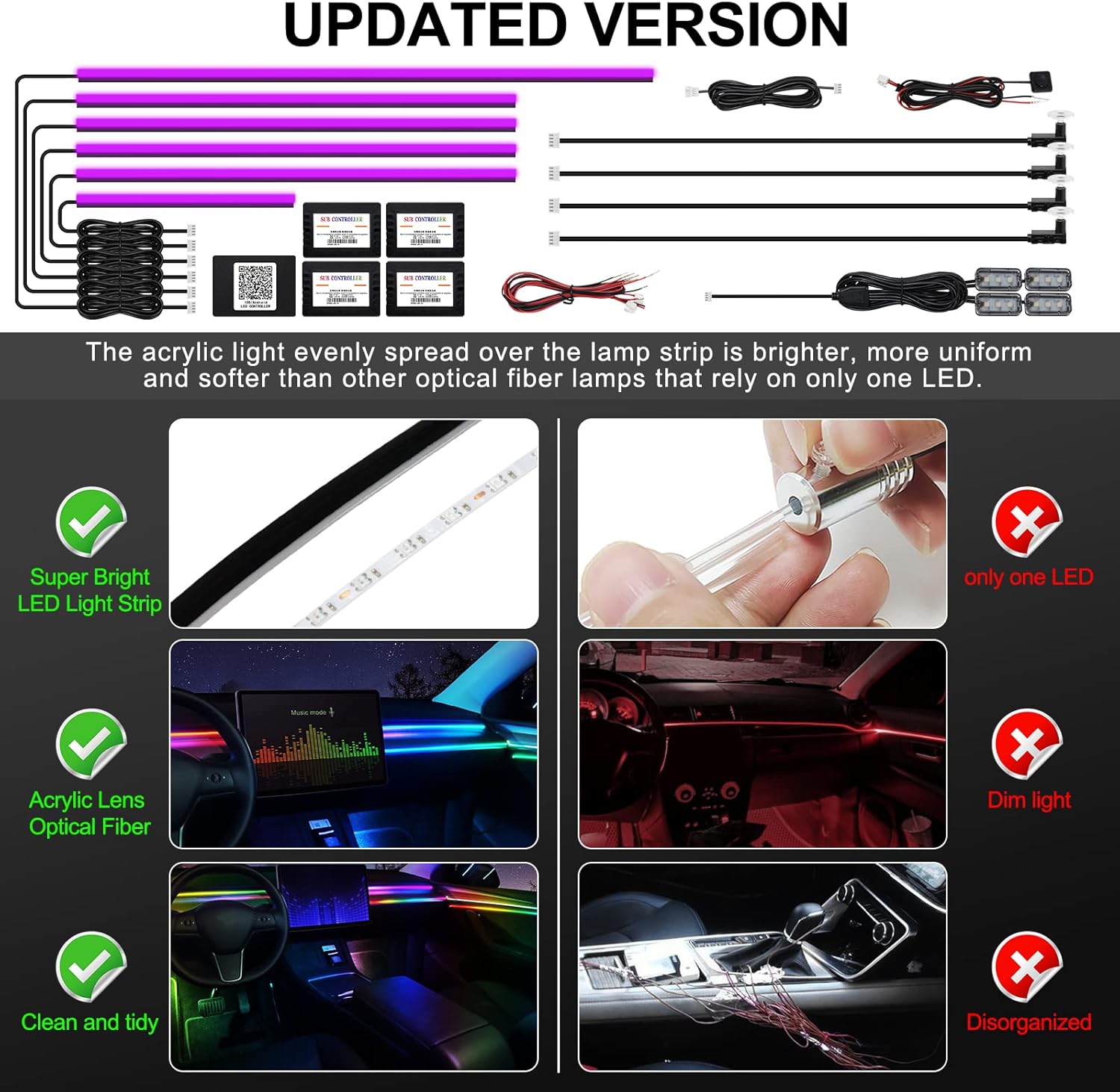 Acrylic Interior Car LED Strip Light with Wireless APP, RGB 14 in 1 with 175 inches 593 LEDs Fiber Optic Ambient Lighting Kits, 16 Million Colors Sound Active Function Car Neon Lights