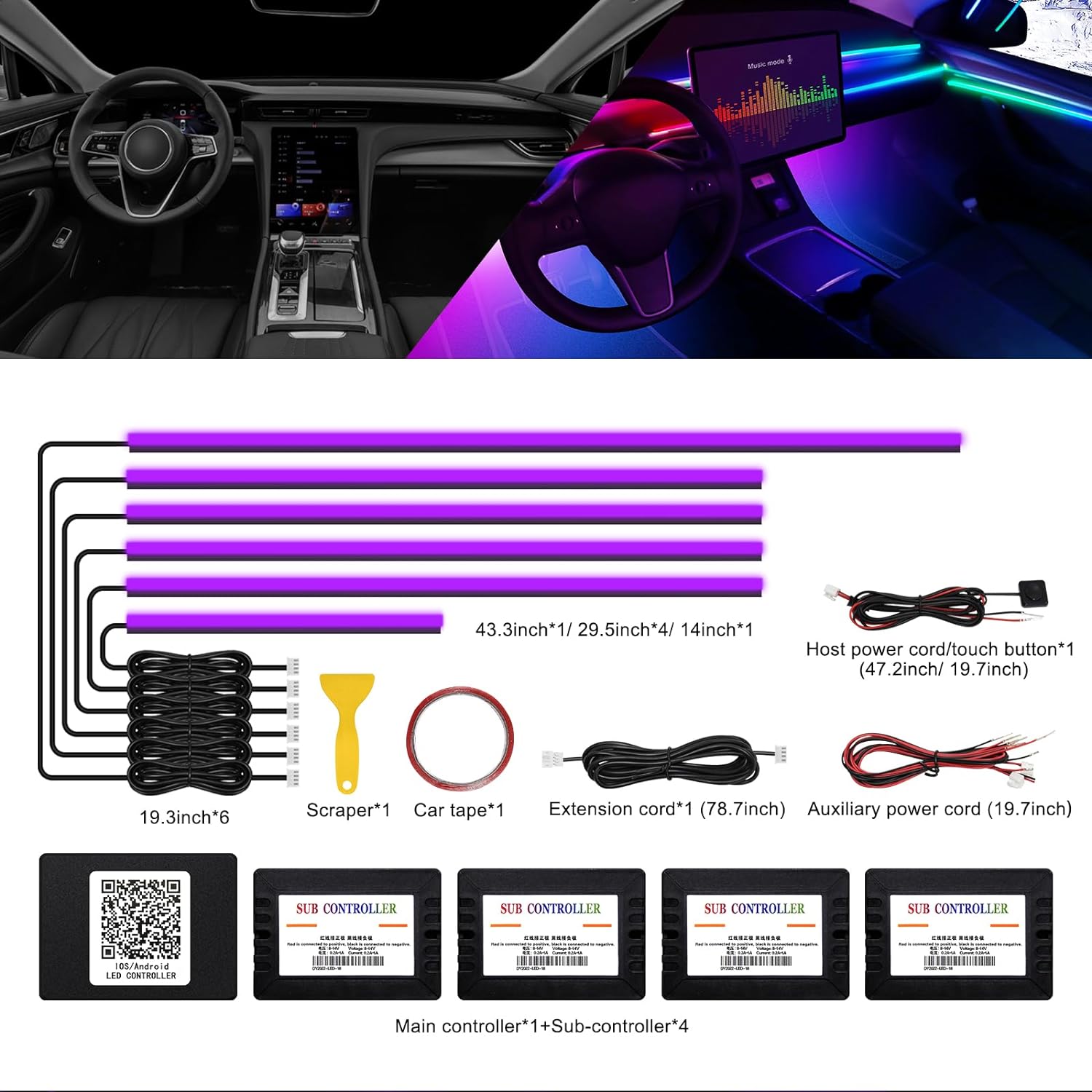 - 【High Bright & Uniform】The RGB Acrylic Ambient Light Strip have super bright LED and acrylic lens and contains 6 LED strips (4*29.5inch+1*43.3inch+1*14inch) , also comes with 1 main controller and 4 sub controllers,and can be flexibly installed on any car by DIY without disorganized, which is plug and play, and and this acrylic light evenly spread over the lamp strip is brighter, more uniform and softer than other optical fiber lamps that rely on only one LED.