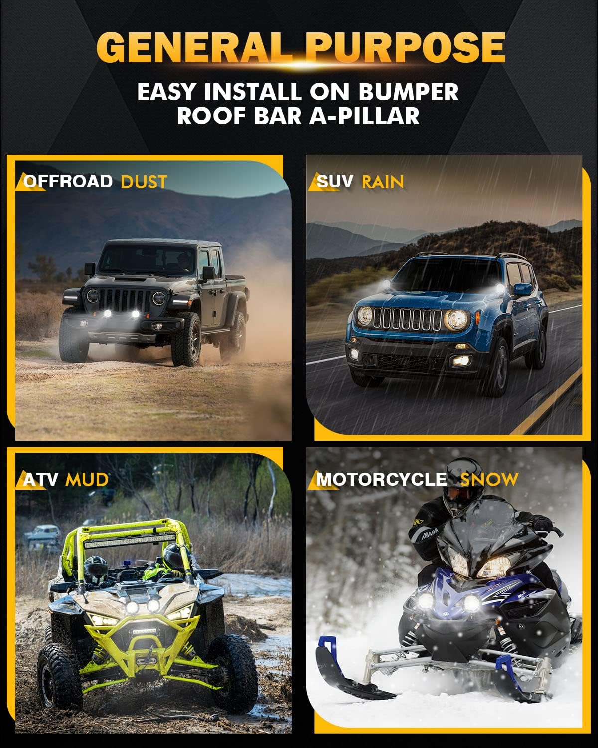 - [BUILT-IN EMC & WIDE ADAPTABILITY] - Utilizing the latest technology to better protect the internal electronic components in lighting and external objects like a radio receiver. Round led driving lights are perfect for 9-32V vehicles and can be mounted in various locations, including on a roof rack, A-pillar, bumper, or grille guard.