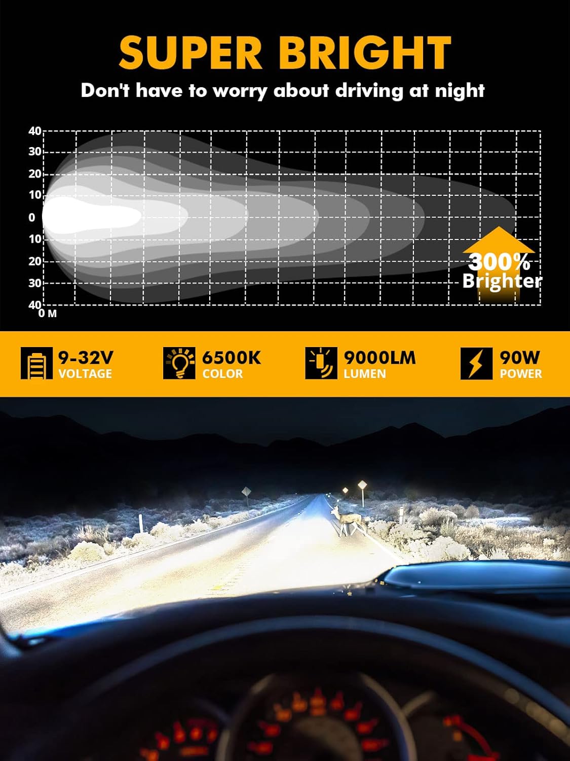 - 【INCREDIBLE BRIGHTNESS】Auxbeam 4 inch 90W LED offroad lights are equipped with 9 pieces high efficiency 3535 LED chipsets and produce up to 9000LM of brilliant light, 300% brighter than your stock light. Allows you to see the left and right clearly anytime.