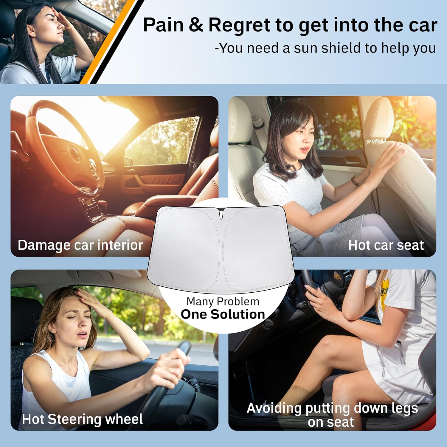 - Easy to Use and Store – This foldable windshield sunshade is built for everyday convenience—simply pop it open for quick installation and fold it down for compact storage. A matching storage pouch is included, allowing it to fit neatly in your glove compartment, side door pocket, or center console when not in use.