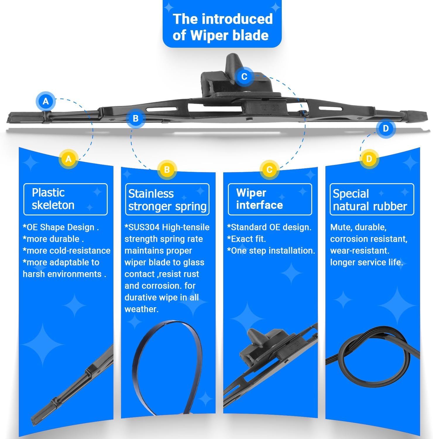 - {WIPER PERFORMANCE}: Natural rubber material making sure the wiping is the best, quiet wiping without judder or squeaking, resistant and a long service life.