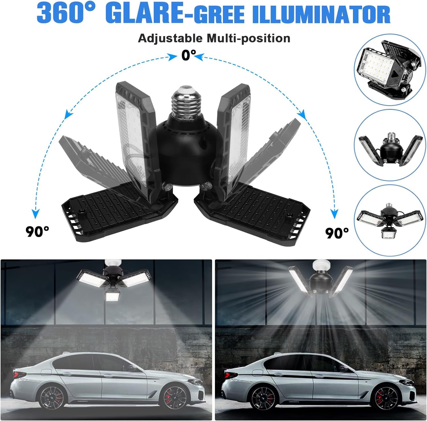 - 【3 Panels Garage Lights】With 3 deformable panels, the best led garage ceiling lights can be adjustable from 0 to 90 degree, which illuminate each corner of your garage in 360 full coverage without visual blind spots and dizziness. The workshop lights will provide better light than traditional light bulb