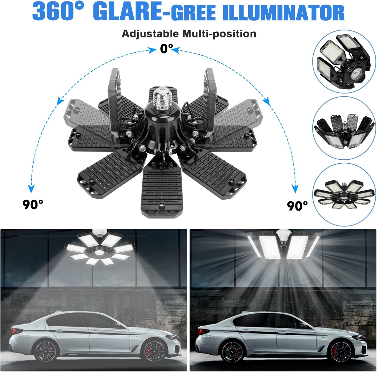 - 【Newest 8 Panels Garage Lights】With 8 deformable panels, the best led garage ceiling lights can be adjustable from 0 to 90 degree, which illuminate each corner of your garage in 360 full coverage without visual blind spots and dizziness. The workshop lights will provide better light than 3, 4,5 and 6 panels garage lights on the market.