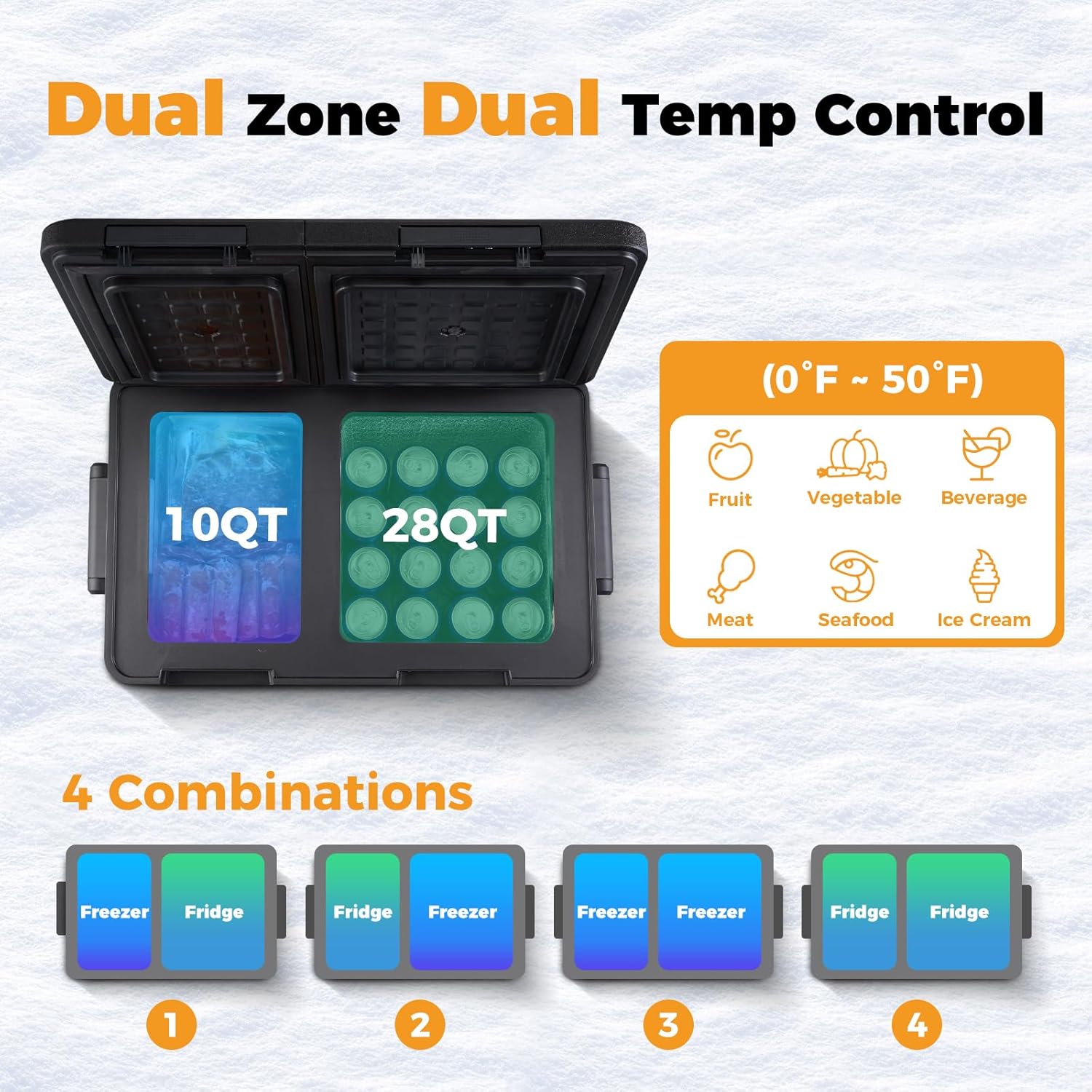 - Dual Zone And Dual Temperature Control Electric Cooler: Setpower 12 Volt Refrigerator is equipped with a "true dual zone design" to avoid flavor transfer and mutual contamination of food between the two zones.And,this portable freezer can be independently controlled from 50°F to 0°F via the LCD panel.You can get a refrigerator and a freezer at the same time
