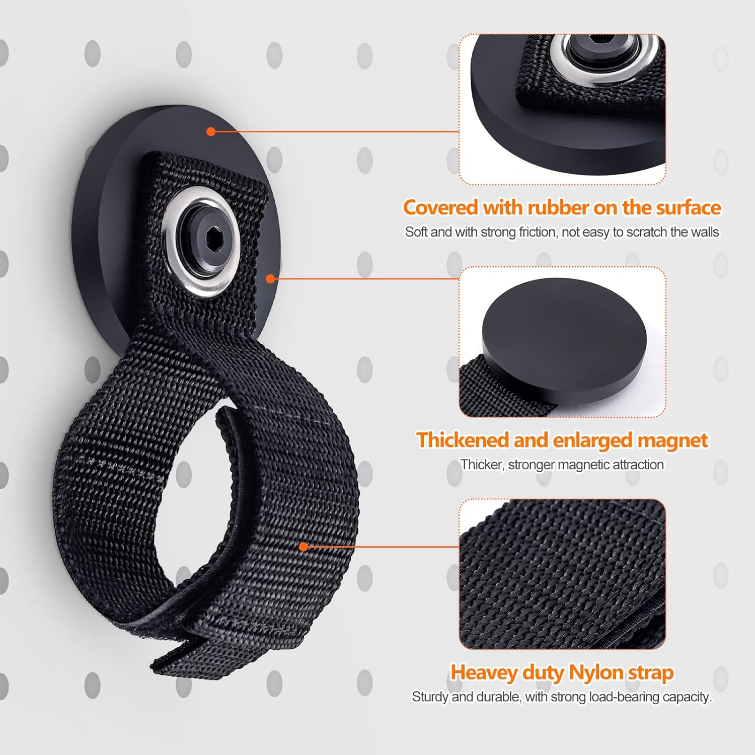 - Sturdy: The outer layer of the magnet is covered with soft, high-friction rubber, allowing it to better adhere to iron surfaces without scratching the paint. The high-density nylon strap has excellent load-bearing capacity, with a hook and loop cycle life of over 10,000 times. This magnet hook with extension cord is the best solution for organizing cables, wires, garden hoses, water pipes, shovels, brooms, and other tools.